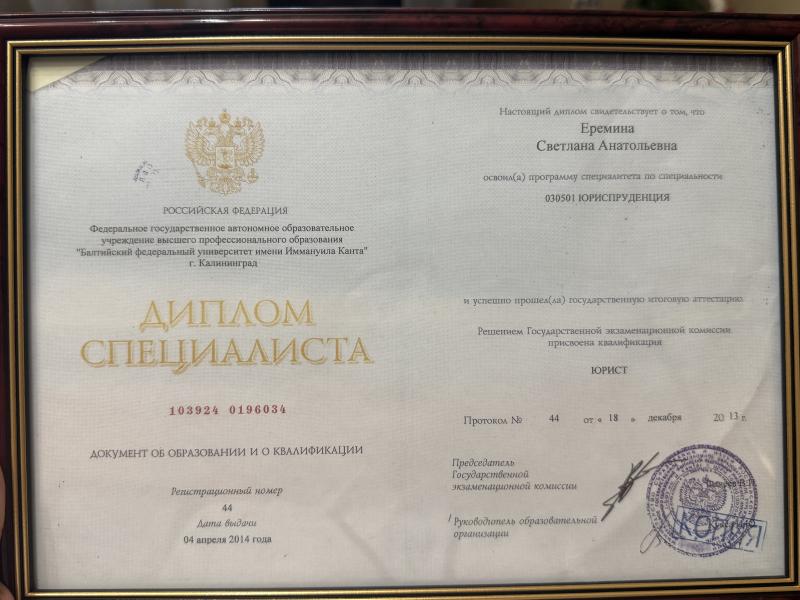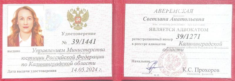 Состою в Адвокатской палате Калининградской области, реестровый номер 39/1271.