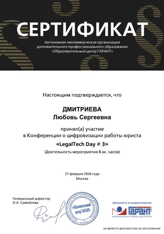 Спасибо Дмитриевой Любови Сергеевне за грамотное составление официальных документов, регулирующих мою деятельность в лице СЗ (1. Догово... Читать далее