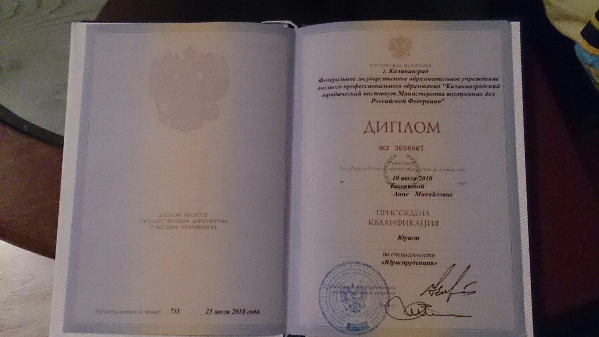 Имею диплом о высшем юридическом образовании. Окончила в 2010 году Калининградский юридический институт.