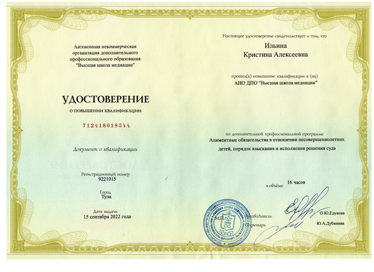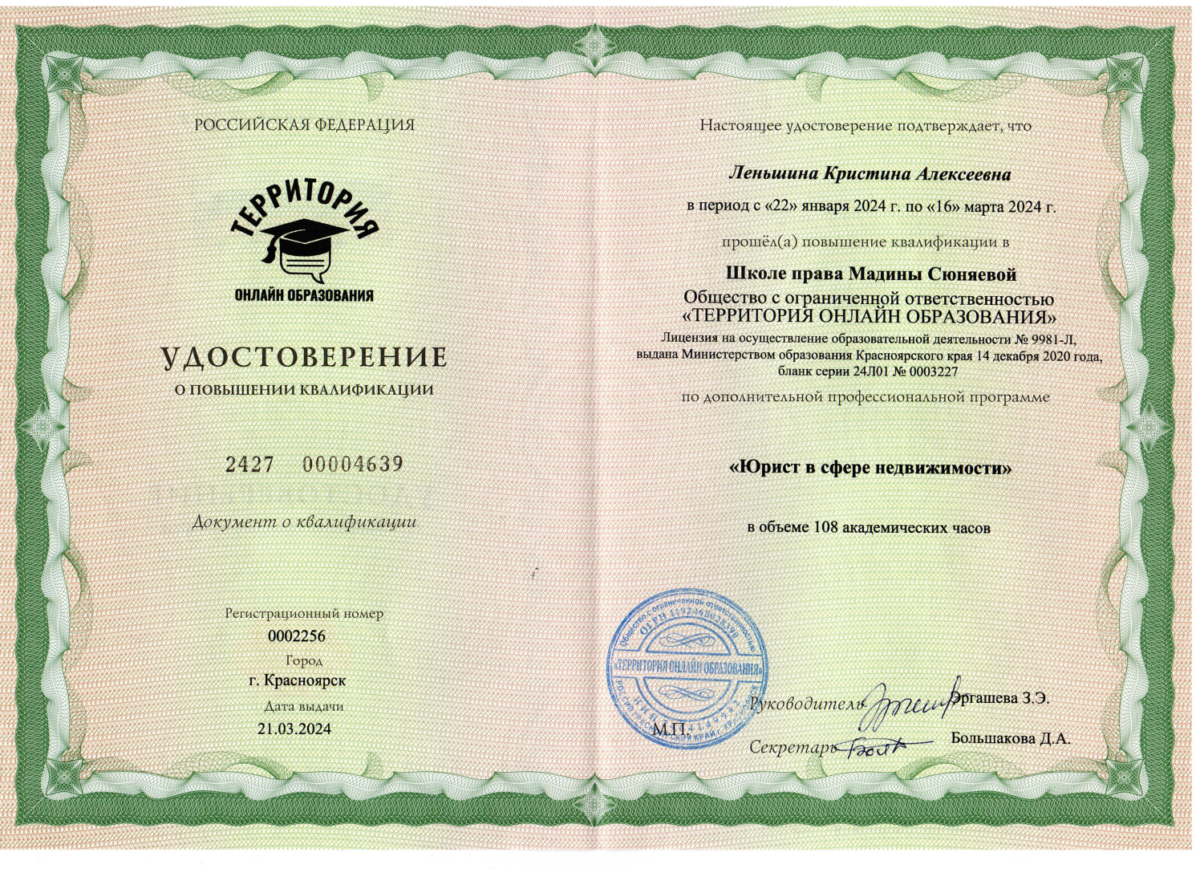 Всем хорошего дня! Меня зовут – Леньшина (Ильина) Кристина Алексеевна. Я являюсь основателем и руководителем юридической фирмы – “TWO LAWYERS”, магистром юриспруденции, специалистом в сфере банкротства физических лиц, семейного права и недвижимости. Я не юрист из разряда – “и жнец, и на дуде игрец”, оказываю услуги по смежным отраслям. Осуществляю практическую деятельность в указанных направлениях с 2019 г. Основной упор в настоящее время сделан на банкротство физических лиц/недвижимость, за плечами огромное количество сложных, но успешных кейсов. Банкротство физических лиц-консультация бесплатная! Занимаюсь сопровождением процедуры банкротства «под ключ» по всей России! Это никаким образом не влияет на качество оказываемых услуг, благо сейчас технологии позволяют присутствовать на судебных заседаниях в режиме-онлайн из любой точки мира.🌍 Активно развиваю канал на тему банкротства физических лиц и недвижимость, где можно найти много полезной информации для себя.