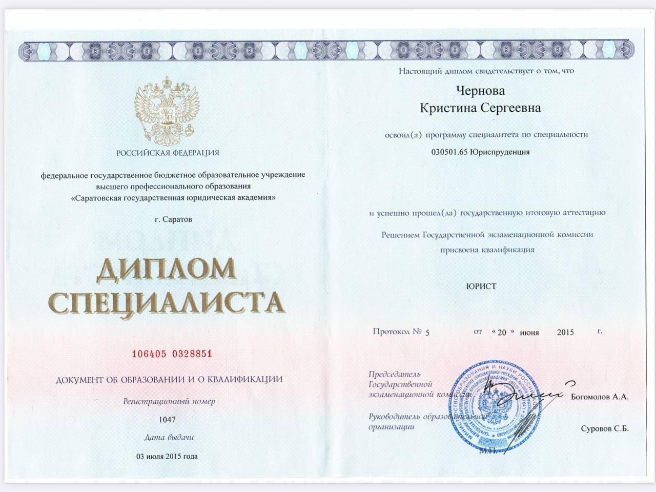 Я — практикующий юрист. Окончила Саратовскую Государственную Юридическую Академию. С 2015 года начала свою карьеру в сфере правосудия, работая секретарём судебного заседания, а затем помощником судьи. Эти годы дали мне прочный фундамент знаний и опыт работы в судебной системе.