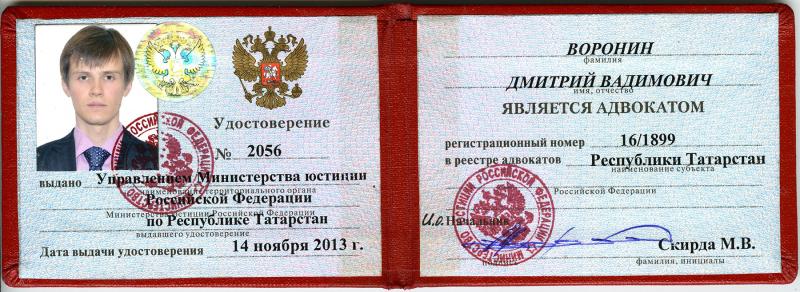 Адвокат Дмитрий Воронин, зарегистрированный в реестре адвокатов Республики Татарстан под номером 16/1899 с 14 ноября 2013 года, предлагает следующие услуги: – Ведение уголовных дел – Защита чести и достоинства – Юридическое сопровождение деятельности организаций – Защита при проверках государственных органов – Арбитражные споры Авторское право – Интеллектуальная собственность – Защита репутации