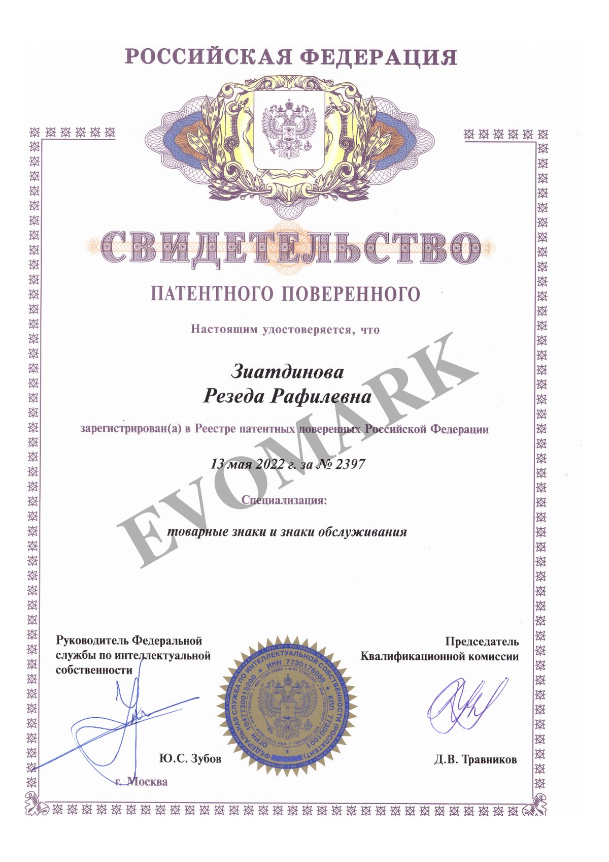 Патентный поверенный Российской Федерации по специализации товарные знаки и знаки обслуживания.