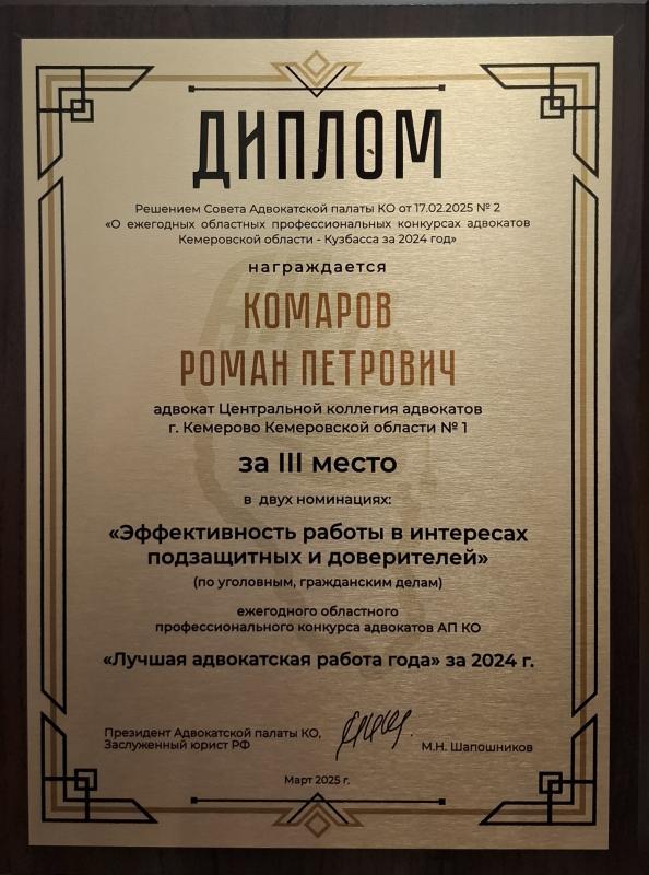 Хочу выразить огромную благодарность адвокату Комарову Р.П. в помощи по моему делу. С первой консультации увидела, насколько доскональн... Читать далее