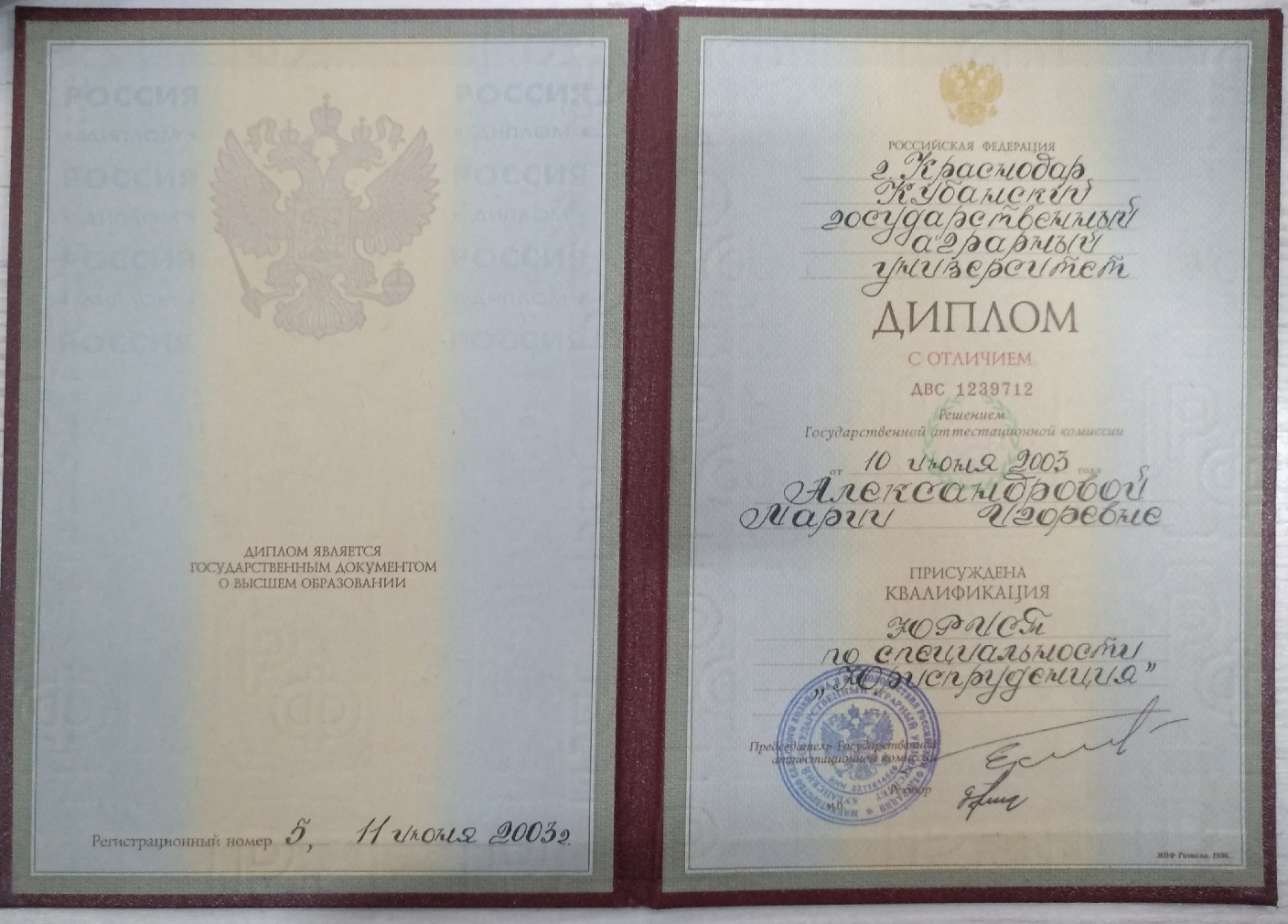 Диплом государственного ВУЗа с отличием, 2003 год. Опыт работы более 18 лет. Арбитраж, договорное право, возврат задолженности, споры с банками, сделки с недвижимостью. Эффективно, надежно, честно.