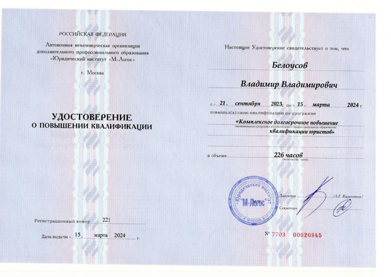 Список судебных дел в карточке адвоката может быть не полным и зависит от того, указан ли адвокат Белоусов Владимир Владимирович в деле или нет