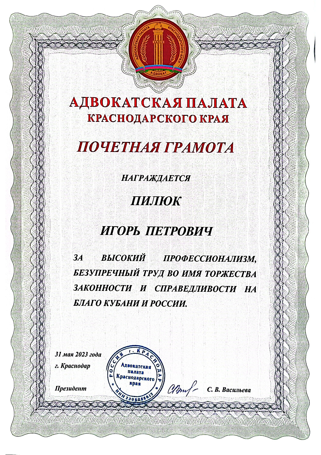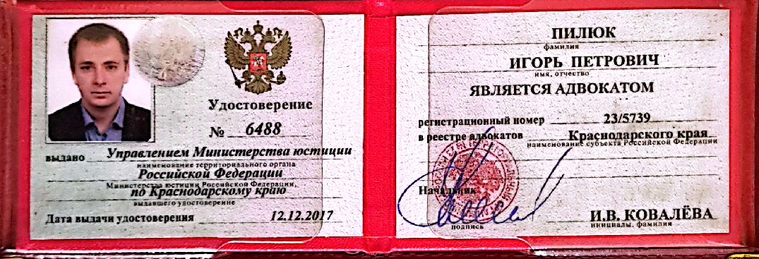 С 1999 года адвокат, очень большой юридический и судебный опыт Адвокатская палата Краснодарского края Реестровый номер 23/4688 Удостоверение адвоката № 5150 от 02.10.2013г.