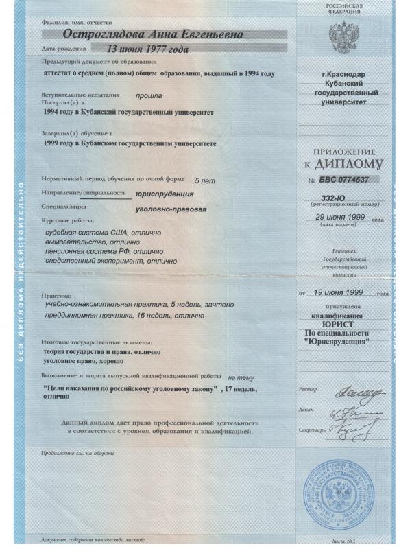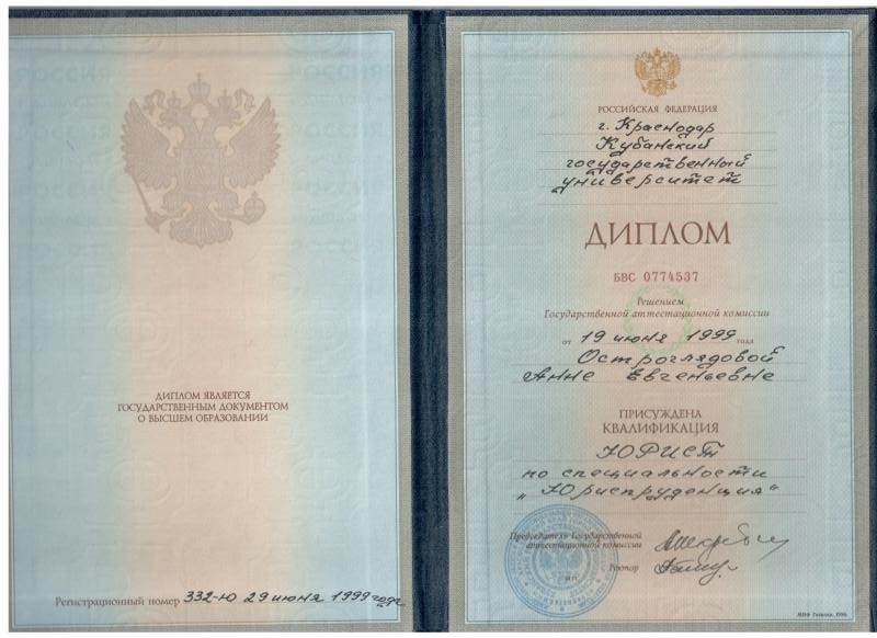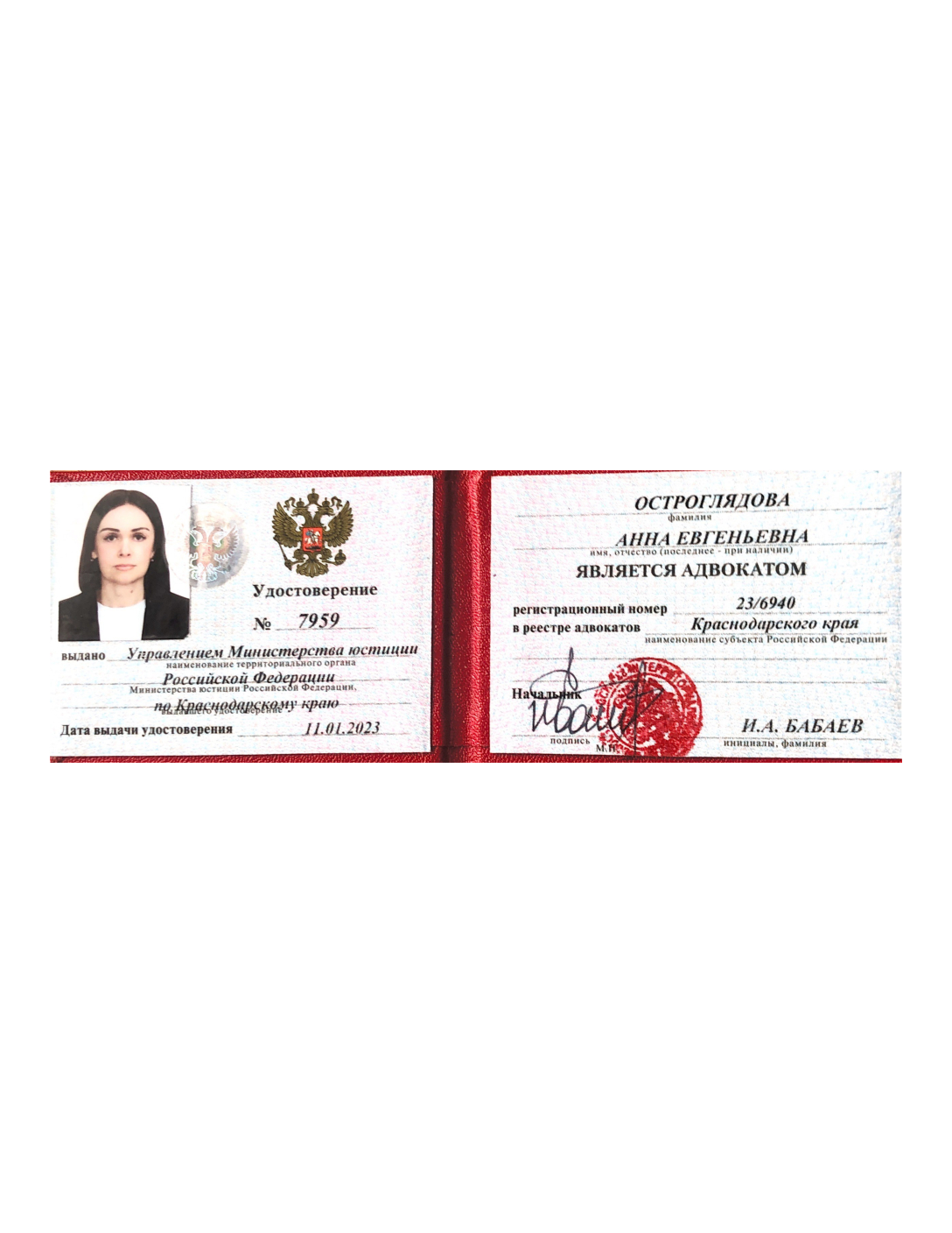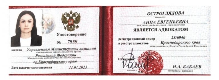 Адвокат Краснодарской краевой коллегии адвокатов Остроглядова Анна Евгеньевна. Удостоверение № 7959, регистрационный номер 23/6940. Опыт работы в юридической сфере 25 лет, в том числе в правоохранительных органах 18 лет. Гарантия качественной, профессиональной и своевременной защиты ваших нарушенных прав по уголовным и гражданским делам. Индивидуальный подход, размер гонорара определяется сложностью вашего дела.