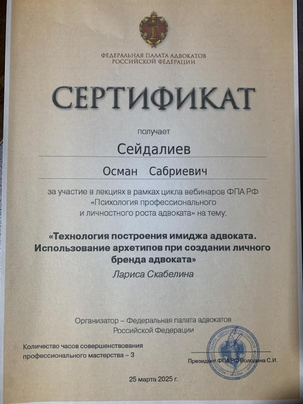 Хочу выразить огромную благодарность Осману Сабриевичу за качественно и добросовестно выполненную работу в уголовном деле. Наша сторона... Читать далее