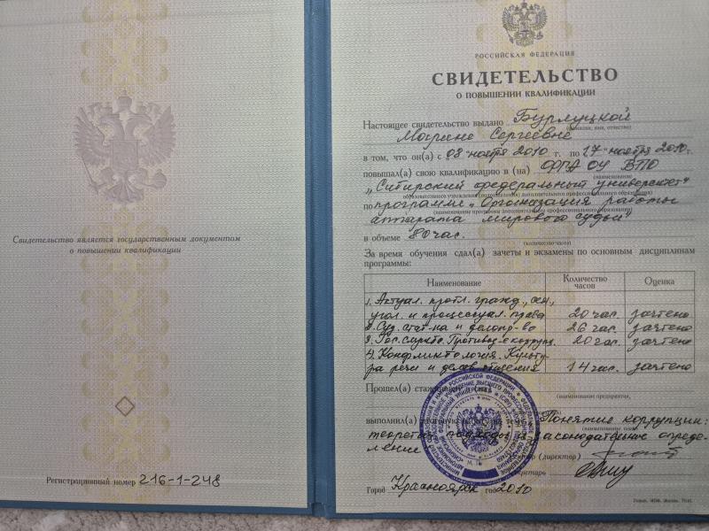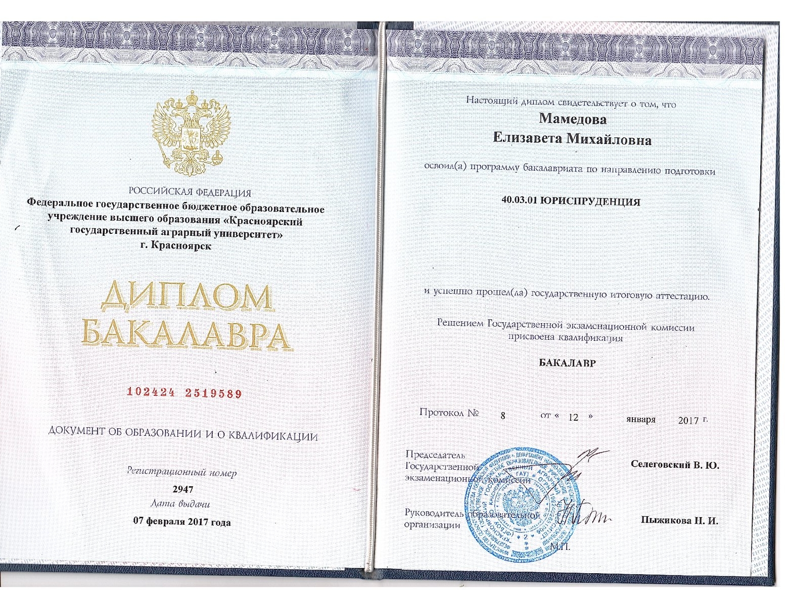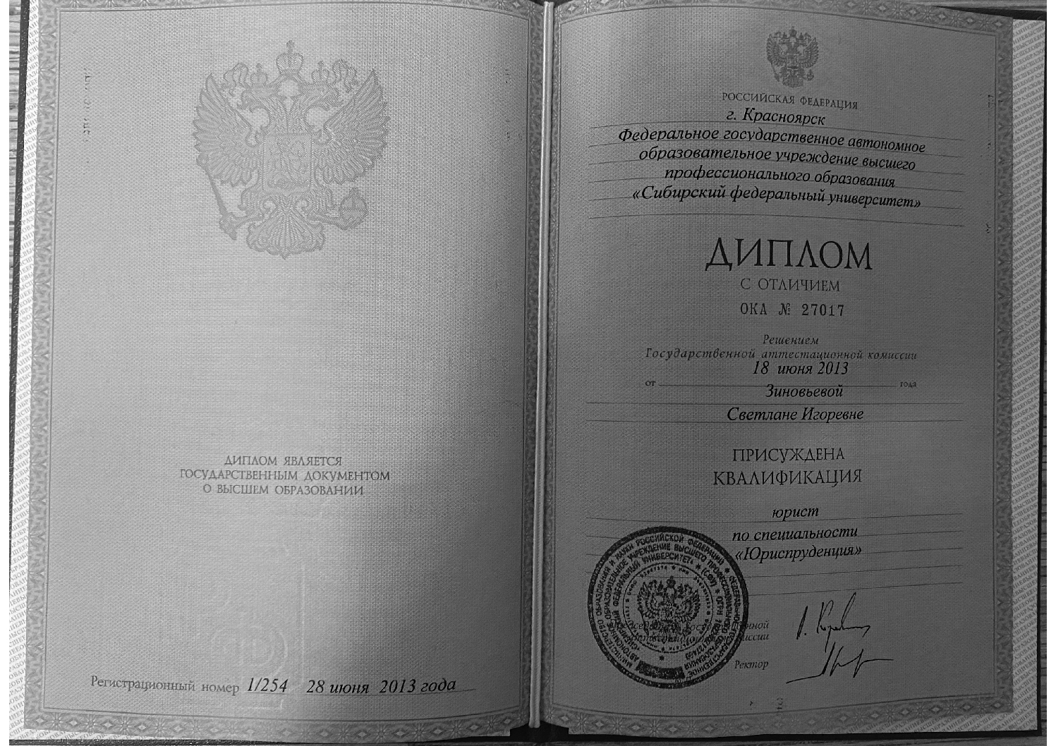 В 2008 году Юридический институт Сибирского федерального университета по специальности «Юриспруденция», квалификация юрист по специальности «Юриспруденция» специализация административное право. В 2008 году Юридический институт Сибирского федерального университета по специальности «Юриспруденция», квалификация юрист по специальности «Юриспруденция» специализация административное право. ПРИОРИТЕТНЫЕ НАПРАВЛЕНИЯ — Представительство юридических лиц в Арбитражном суде. — Защита интересов граждан по гражданским спорам. — Наследственные споры. — Семейные споры, определение места жительства детей, порядка общения ребенка с родителями,бабушками, дедушками. Лишение родительских прав. — Дела особой сложности защиты прав потребителей. — Медицинские дела. — Жилищные дела. — Земельные дела. — Оспаривание решений, действий (бездействия) государственных органов и органов местного самоуправления. — Защита и представление интересов потерпевших по уголовным делам. — Споры по ДТП.