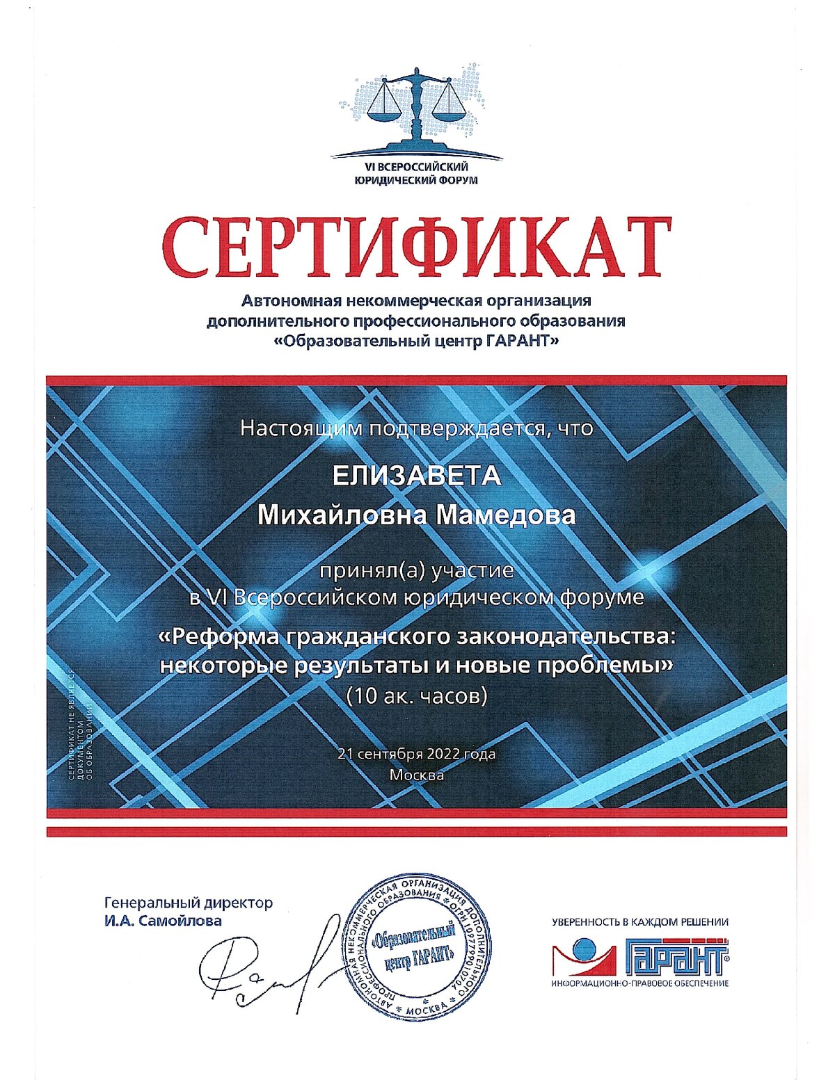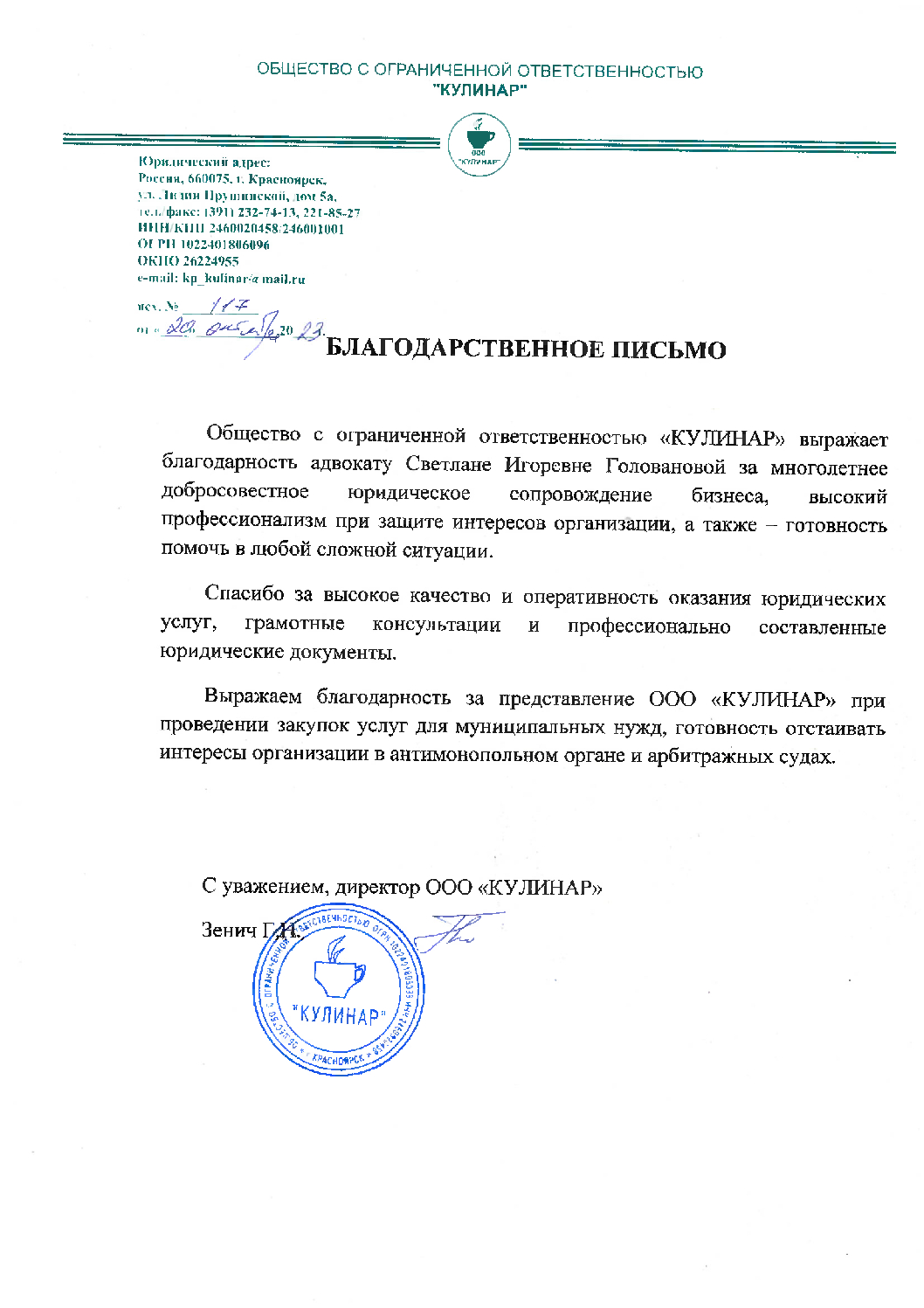 Более чем за 20 лет общей юридической практики я приобрела значительный опыт работы, как по гражданским, административным, арбитражным делам, так и по уголовным делам самой различной направленности. Считаю, что современный адвокат должен быть универсальным специалистом с широким опытом и квалификацией в различных отраслях права, что позволит более эффективно решить любую проблему, посмотрев на нее с различных сторон права.
