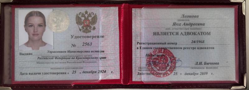 Здравствуйте! Меня зовут Леонова Яна Андреевна. Я практикующий адвокат, член Ленинской коллегии адвокатов г. Красноярска Красноярского края. Регистрационный номер в реестре адвокатов Красноярского края 24/1968. Я готова помочь Вам в разрешении Ваших юридических проблем на любой стадии их развития, вне зависимости от сложности и нестандартности проблемы. Квалифицированная юридическая помощь в сфере уголовных, административных и гражданских правоотношений. Помощь участникам СВО и членам их семей по военным вопросам. Я ответственно и внимательно отношусь к делу каждого доверителя, добросовестно отстаиваю права и законные интересы, при этом проявляю человеческое отношение к клиентам. Помогаю найти выход из самой сложной ситуации, используя исключительно законные методы.