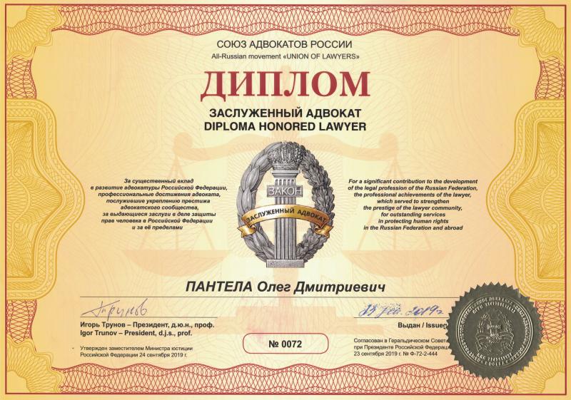 Коллегия адвокатов Красноярского края “Доверие” Заслуженный адвокат Пантела Олег Дмитриевич. Регистрационный номер 24/1098 в реестре адвокатов Красноярского края. Юридический психолог. Президент Красноярского регионального отделения Союза адвокатов России. Председатель Коллегии адвокатов Красноярского края «Доверие» * Защита по уголовным делам. * Представление интересов потерпевших. * Юридическая помощь при ДТП.(ДТП с пострадавшими) * СИЗО (обжалование ареста, приговора).Оказание юридической помощи арестованным (посещение СИЗО). С каждым клиентом заключается соглашение на оказание юридической помощи, условия которого, а так же стоимость оказываемой услуги оговариваются сторонами совместно.