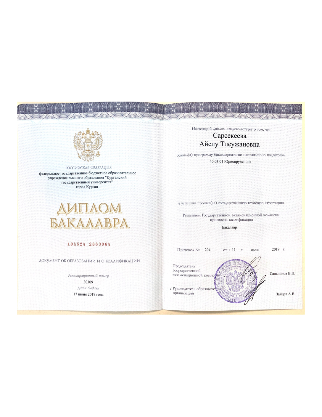 Меня зовут Сарсекеева Айслу Тлеужановна. В 2019 году я окончила Курганский государственный университет по специальности “Юриспруденция” и получила степень бакалавра. С сентября 2019 года по март 2021 года работала стажёром адвоката. В марте 2021 года успешно сдала квалификационный экзамен, и мне был присвоен статус адвоката. Уже более четырех лет я занимаюсь защитой на стадии предварительного расследования и в суде, представляю интересы клиентов в гражданских процессах и составляю правовые документы.