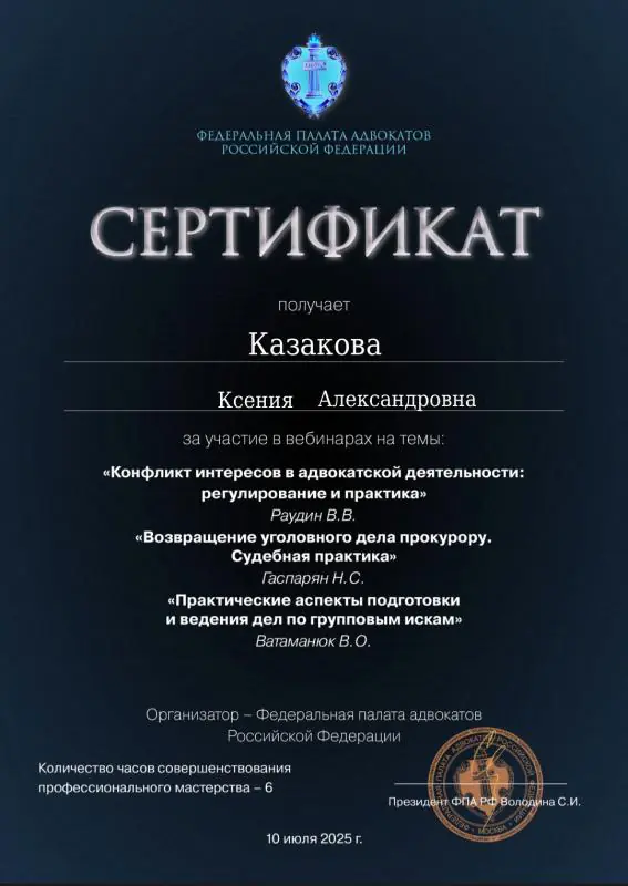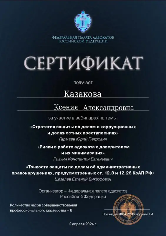 Статус адвоката был присвоен в 2020 году после успешного прохождения квалификационного экзамена. В течение продолжительной судебной практики удалось получить успешный опыт ведения дел во всех инстанциях, включая Верховный Суд РФ.