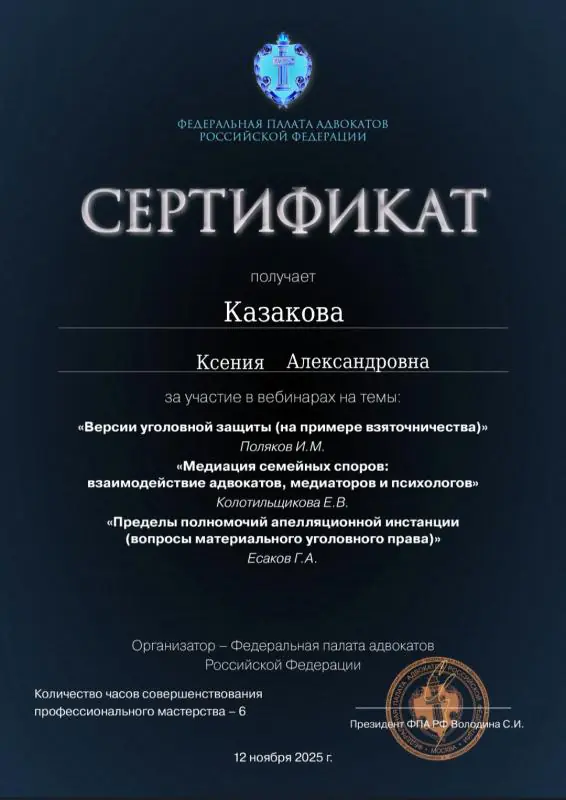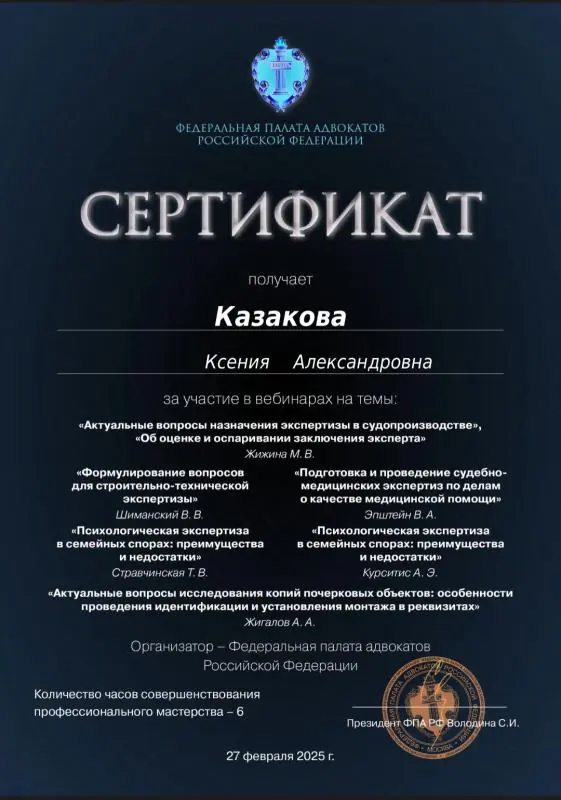 Список судебных дел в карточке адвоката может быть не полным и зависит от того, указан ли адвокат Казакова Ксения Александровна в деле или нет