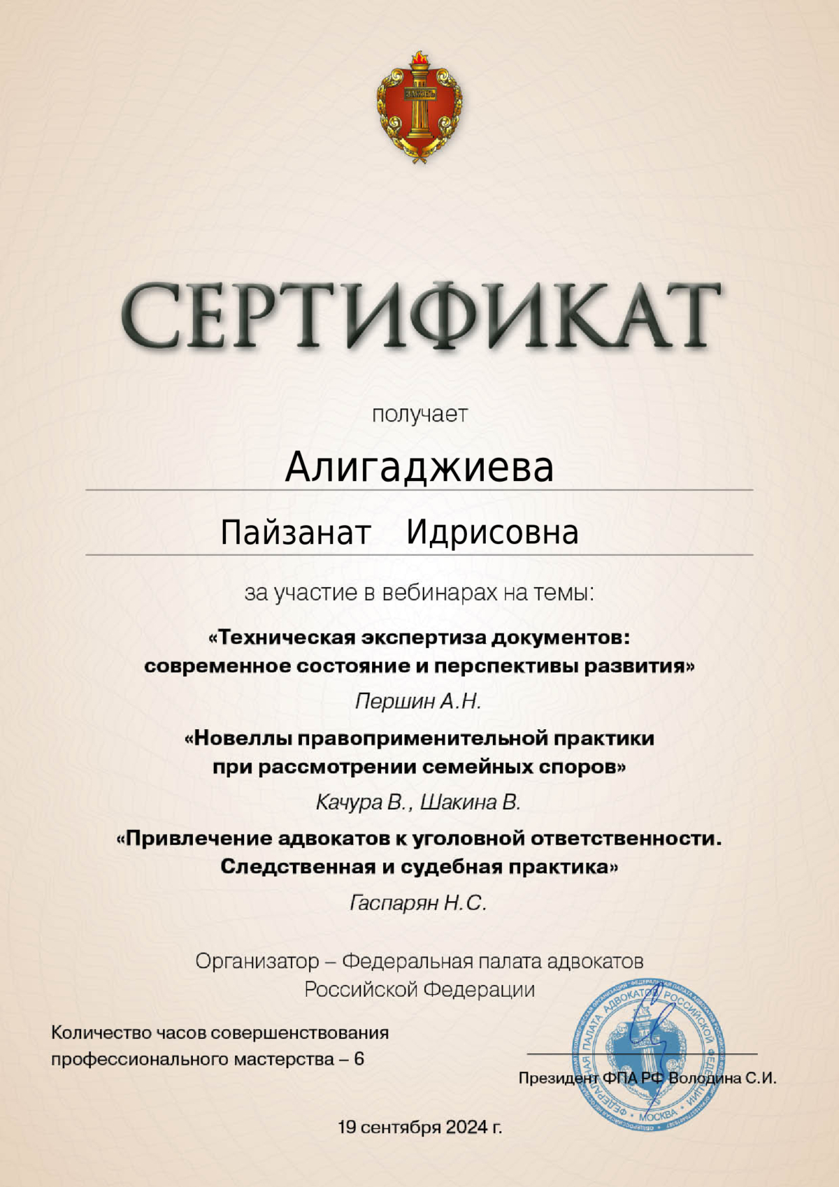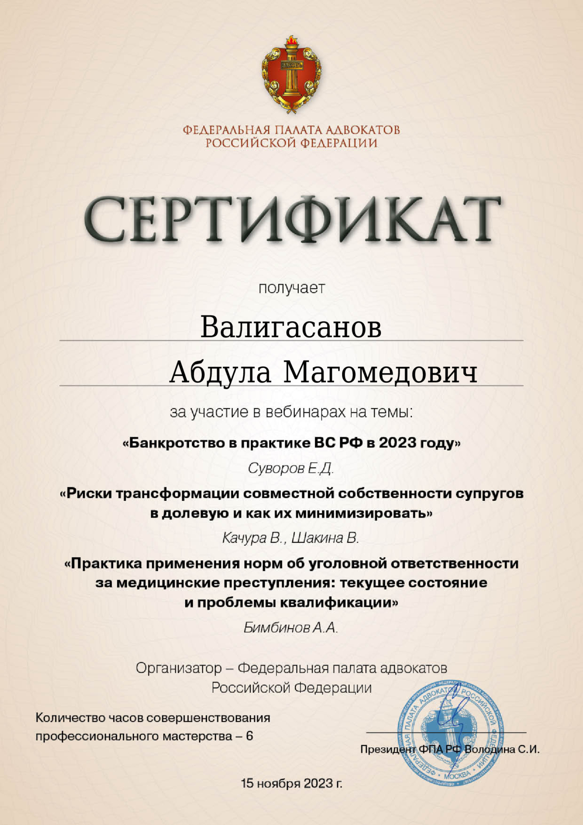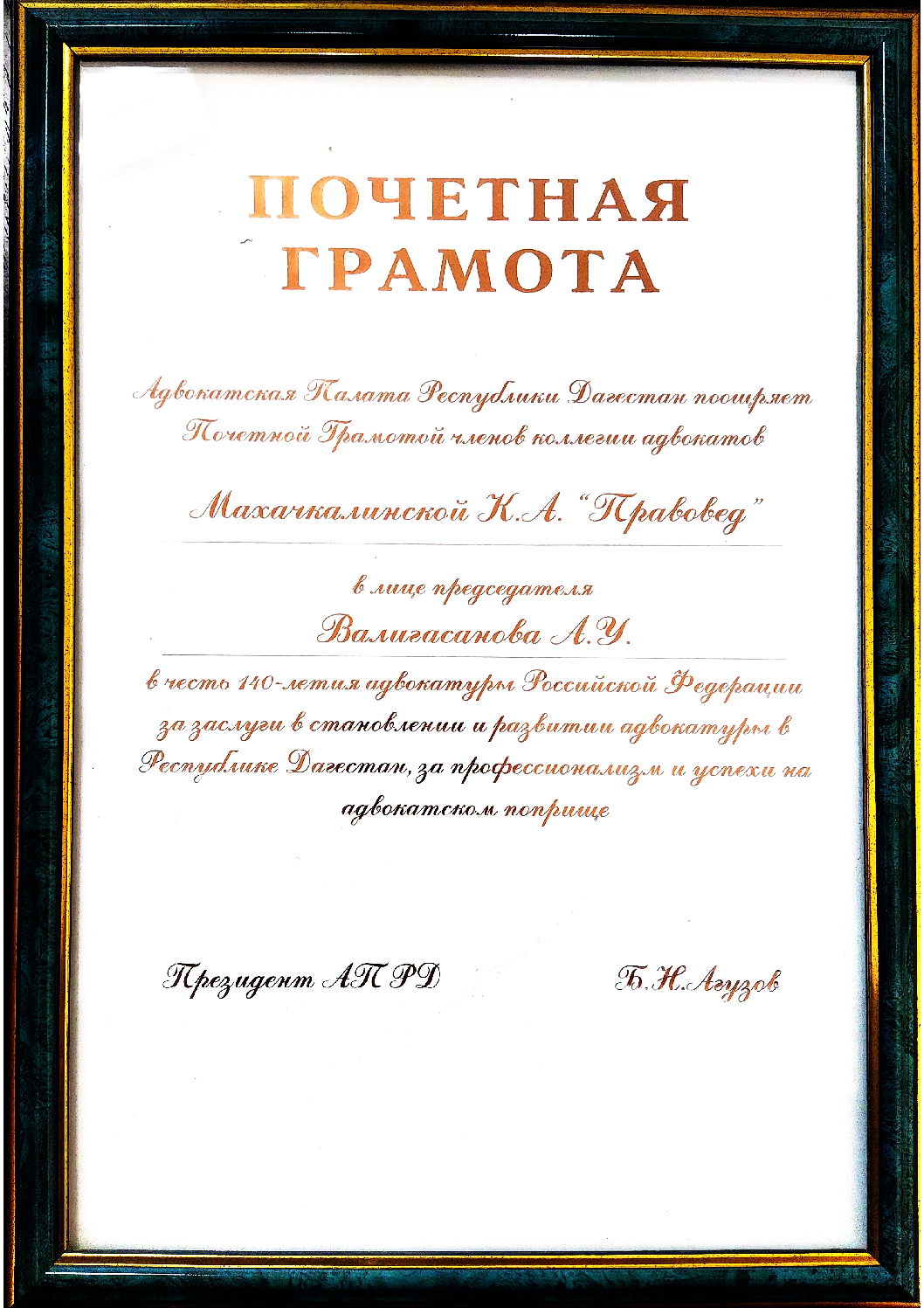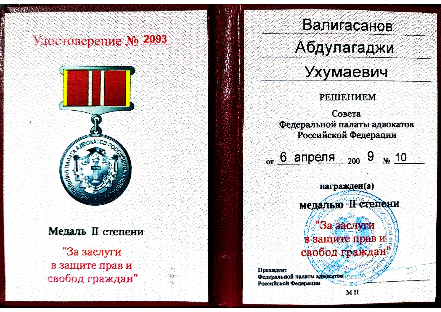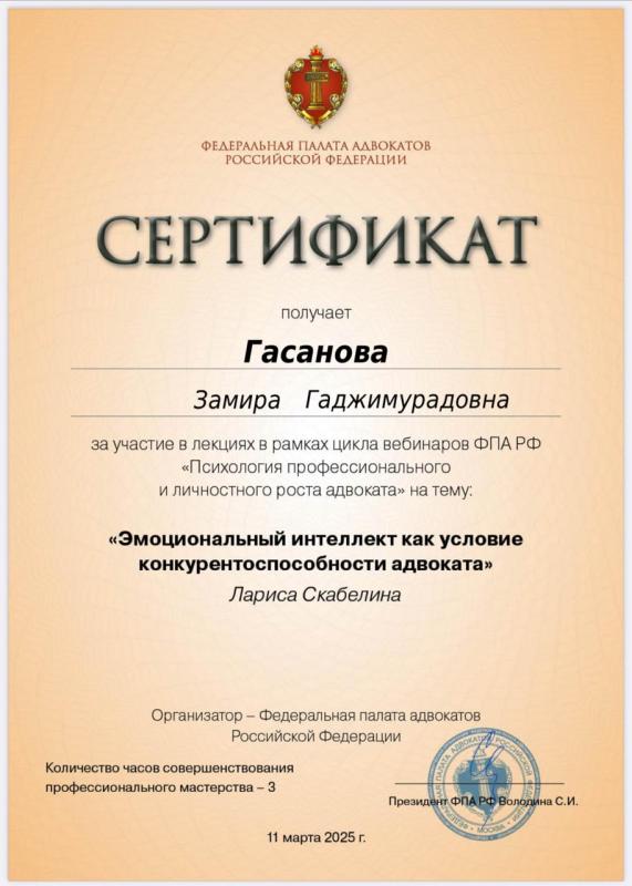 Адвокат Адвокатской Палаты Республики Дагестан, председатель адвокатского образования Коллегии адвокатов «ЮСТИНА», кандидат исторических наук