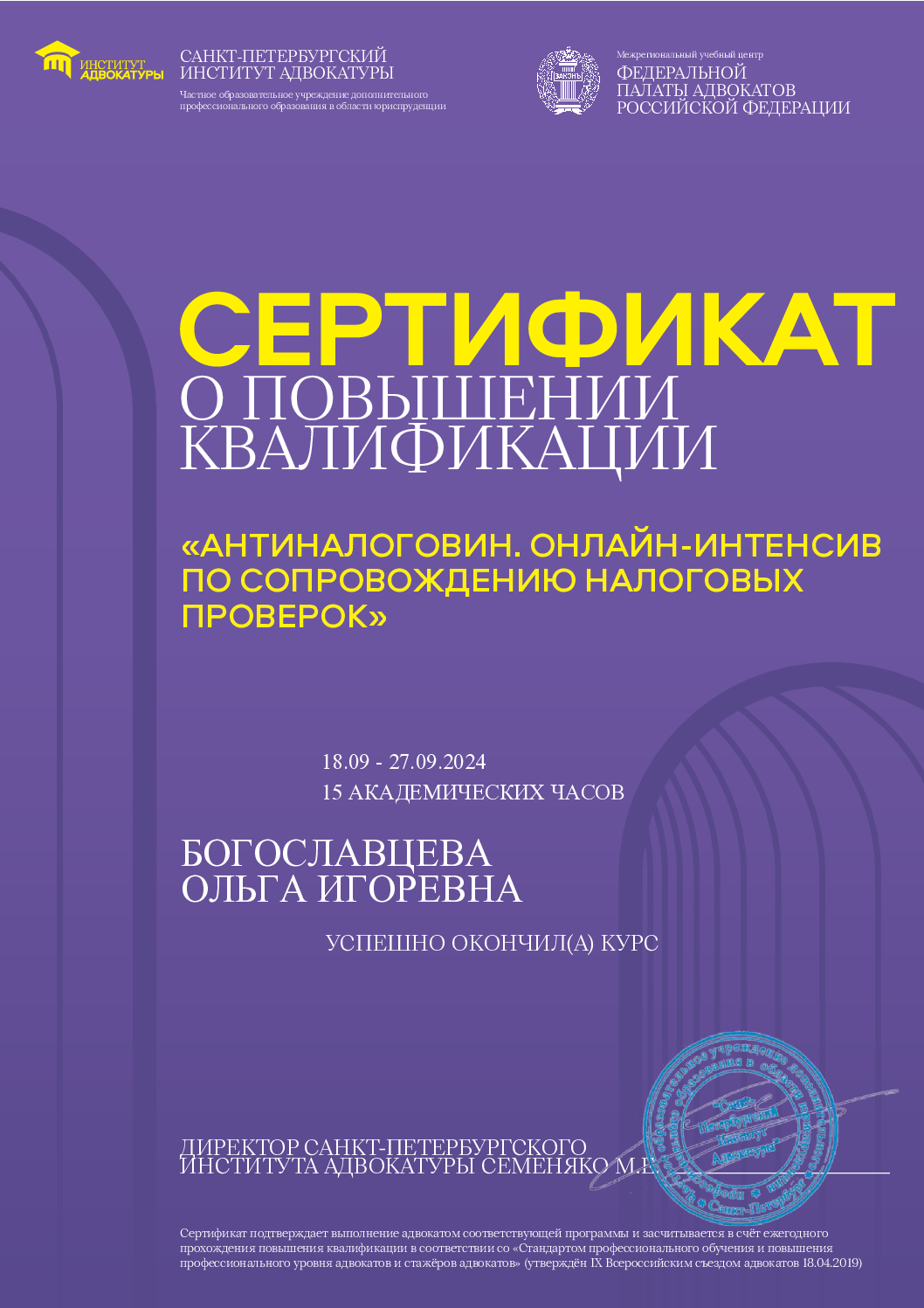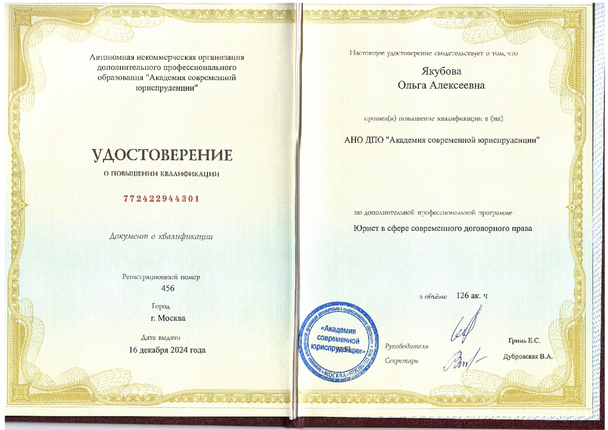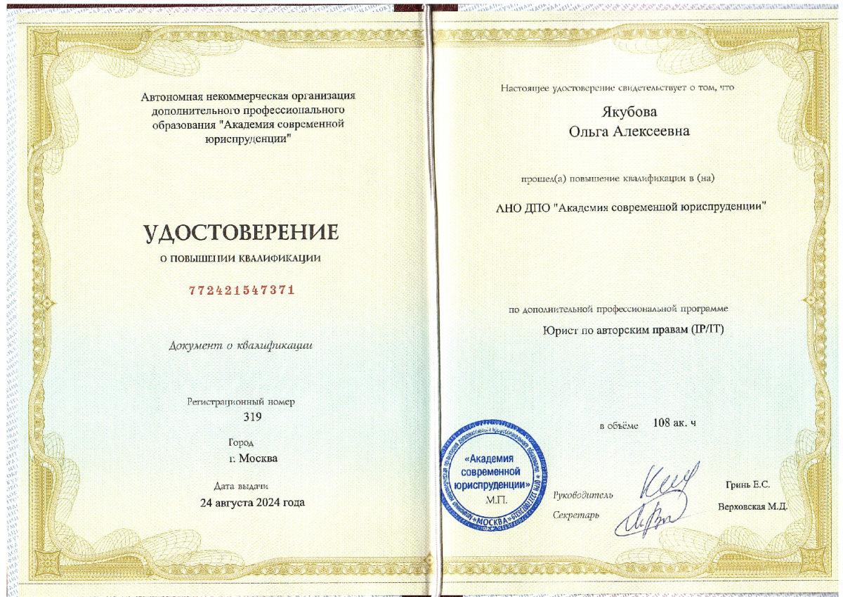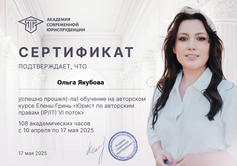 Постоянно развиваюсь: прохожу лекции, семинары и повышения квалификации, участвую в общественной деятельности, также в 2025 принимала участие в МИЮФ и ПМЮФ.