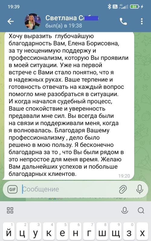 Здравствуйте! Меня зовут Елена Борисовна, я судебный юрист с 15-летним опытом работы как в корпоративной среде, так и в частной практике.