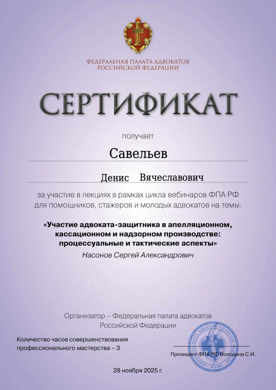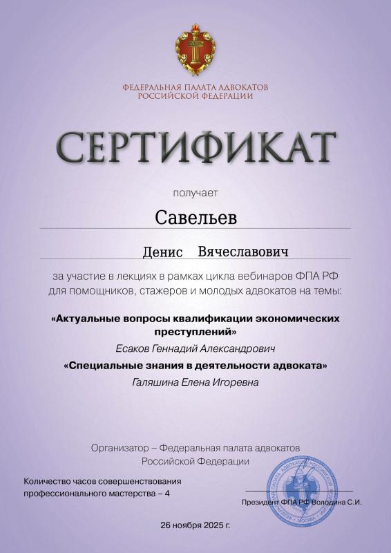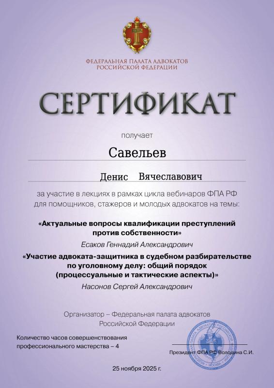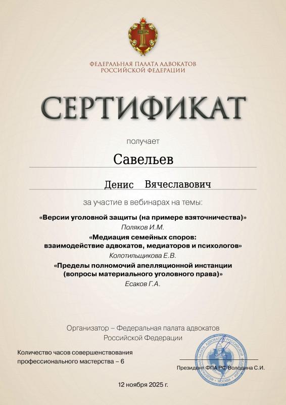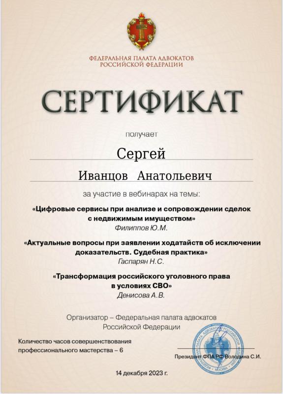 Здравствуйте! Я —Иванцов Сергей, адвокат с более чем 15-летним опытом работы. Обладаю значительным практическим опытом и оказываю качественную юридическую помощь. Длительное время защищаю доверителей по уголовным делам, а также представляю интересы физических и юридических лиц в гражданских, административных и арбитражных судах. Готов ответить на ваши вопросы и помочь в решении юридических проблем.