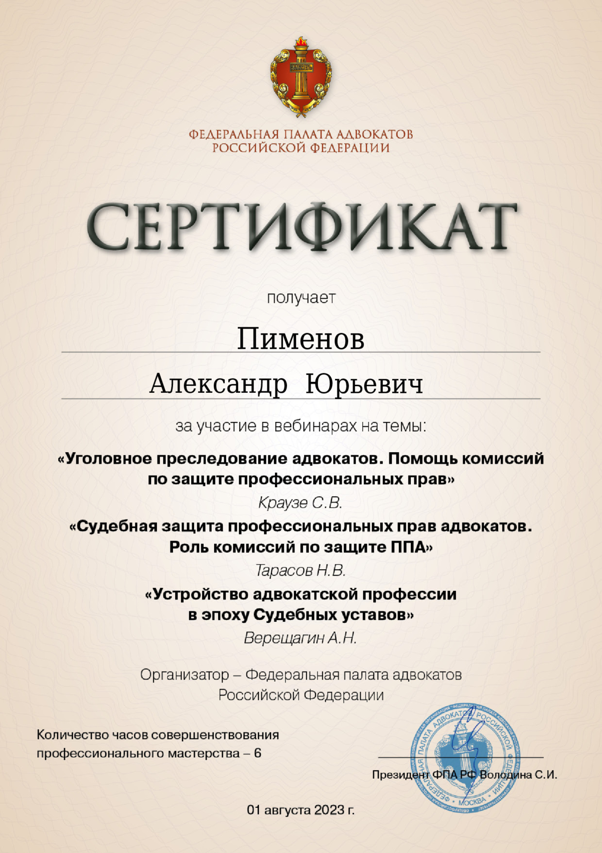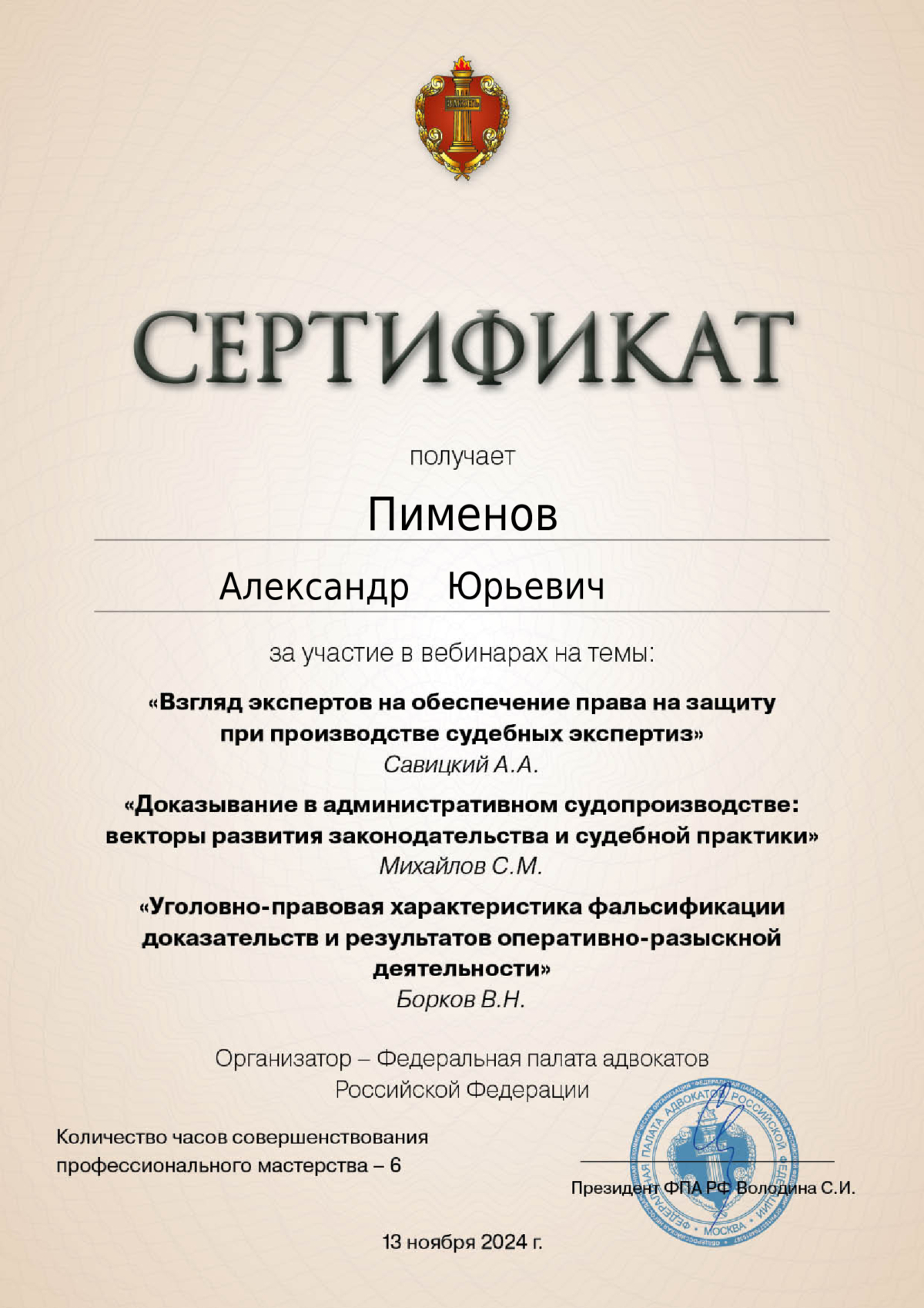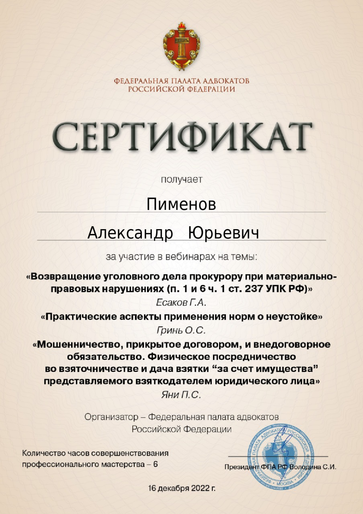 Здравствуйте! Меня зовут Александр Пименов, я адвокат, член адвокатской палаты Москвы. Имею значительный опыт работы по уголовным и гражданским делам. При разработке стратегии защиты интересов клиентов я избегаю стандартных шаблонов. В моей практике есть случаи прекращения уголовного преследования на стадии следствия, оправдательные приговоры, изменения обвинений в сторону смягчения, а также успешные решения по гражданским и арбитражным спорам. Я понимаю, что каждое дело уникально, и подхожу к решению задач с максимальной ответственностью и вниманием к деталям. Всегда открыт для диалога и готов честно рассказать о перспективах вашего дела. Вы можете быть уверены в квалифицированной юридической помощи — ваши права будут защищены с максимальной эффективностью, и вы всегда будете в курсе происходящего. Я помогу вам разобраться в юридических вопросах и предложу оптимальные варианты решений.