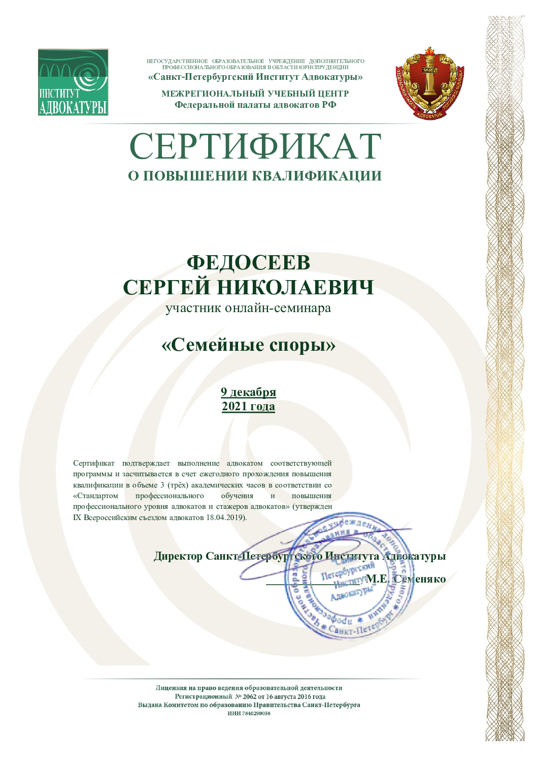 Адвокат с более чем 20-летним опытом работы, кандидат юридических наук, доцент кафедры. Специализируюсь на семейных, жилищных и наследственных делах любой сложности. В 2019 году получил звание «Почетный адвокат России». Основные направления работы включают: расторжение брака, раздел имущества супругов, определение места жительства ребенка, порядок общения с ребенком, оспаривание отцовства и другие вопросы. Также занимаюсь признанием завещания недействительным, восстановлением срока на принятие наследства и судебным разделом наследственного имущества. Веду жилищные споры, возврат долгов и многое другое. Более подробную информацию можно найти на моем сайте: www.advokat-androsov.ru.