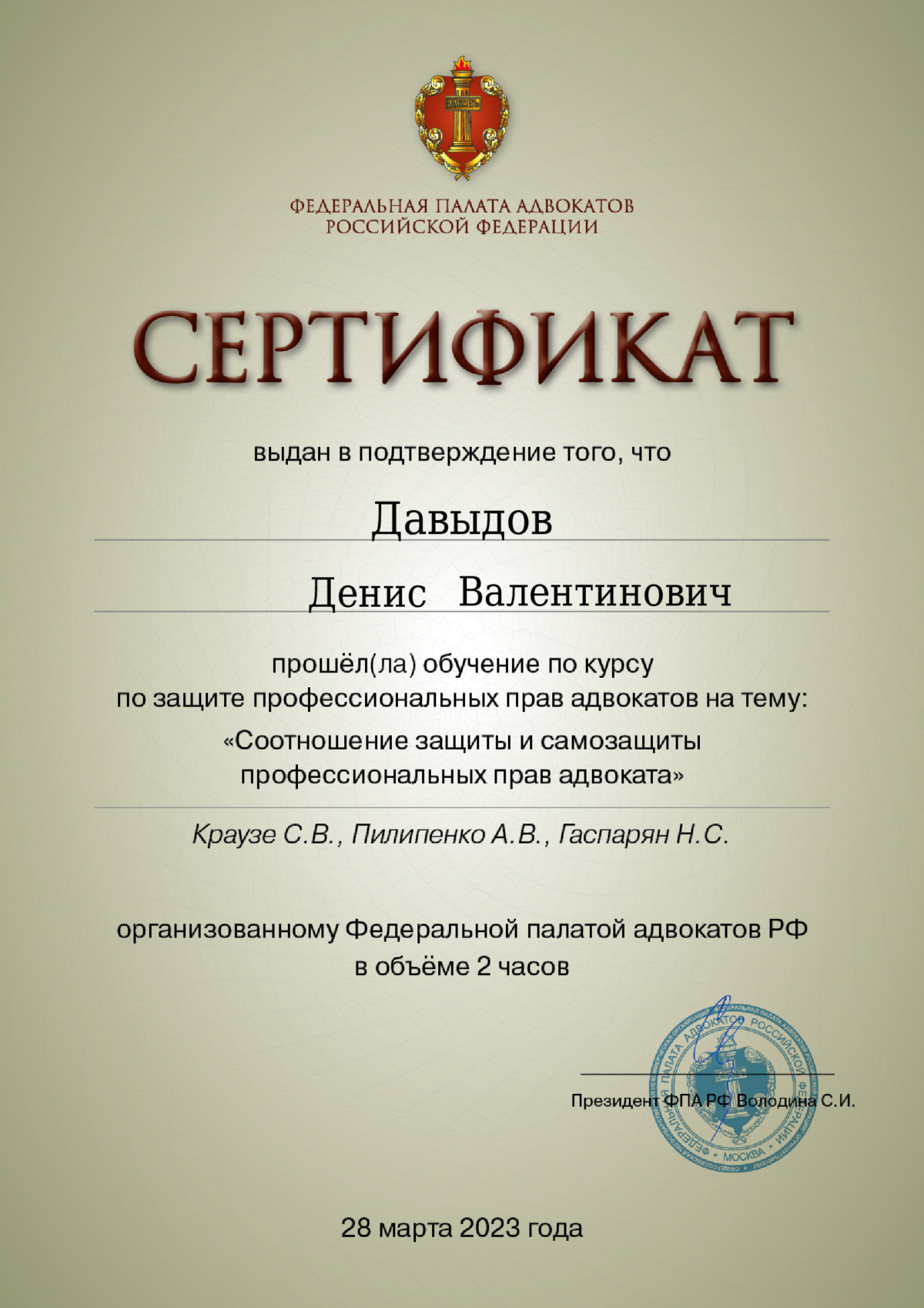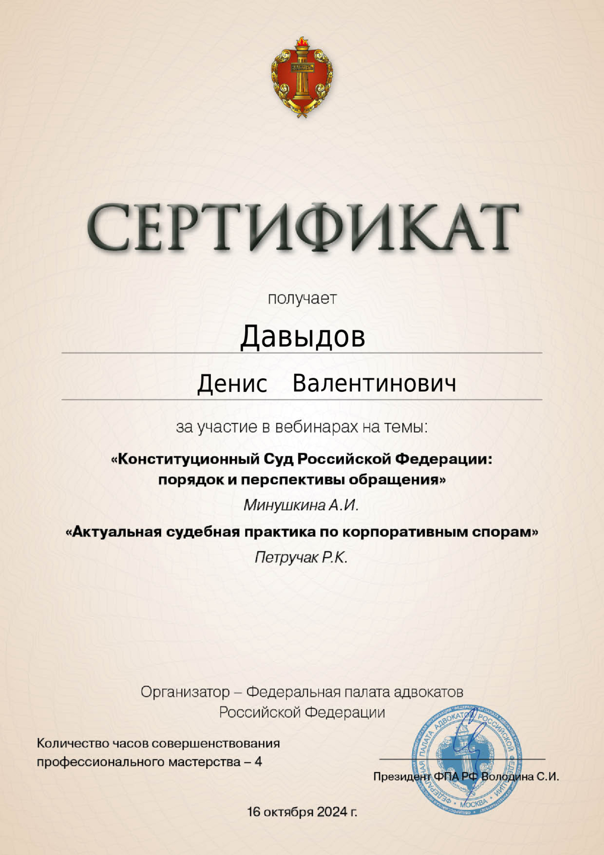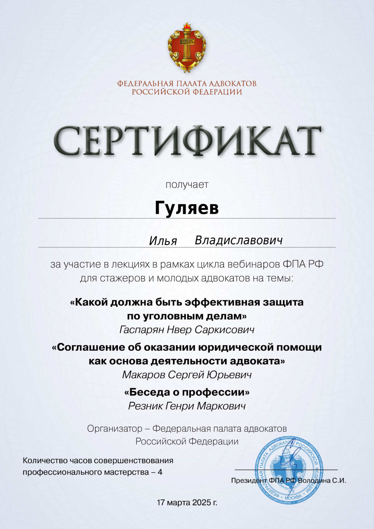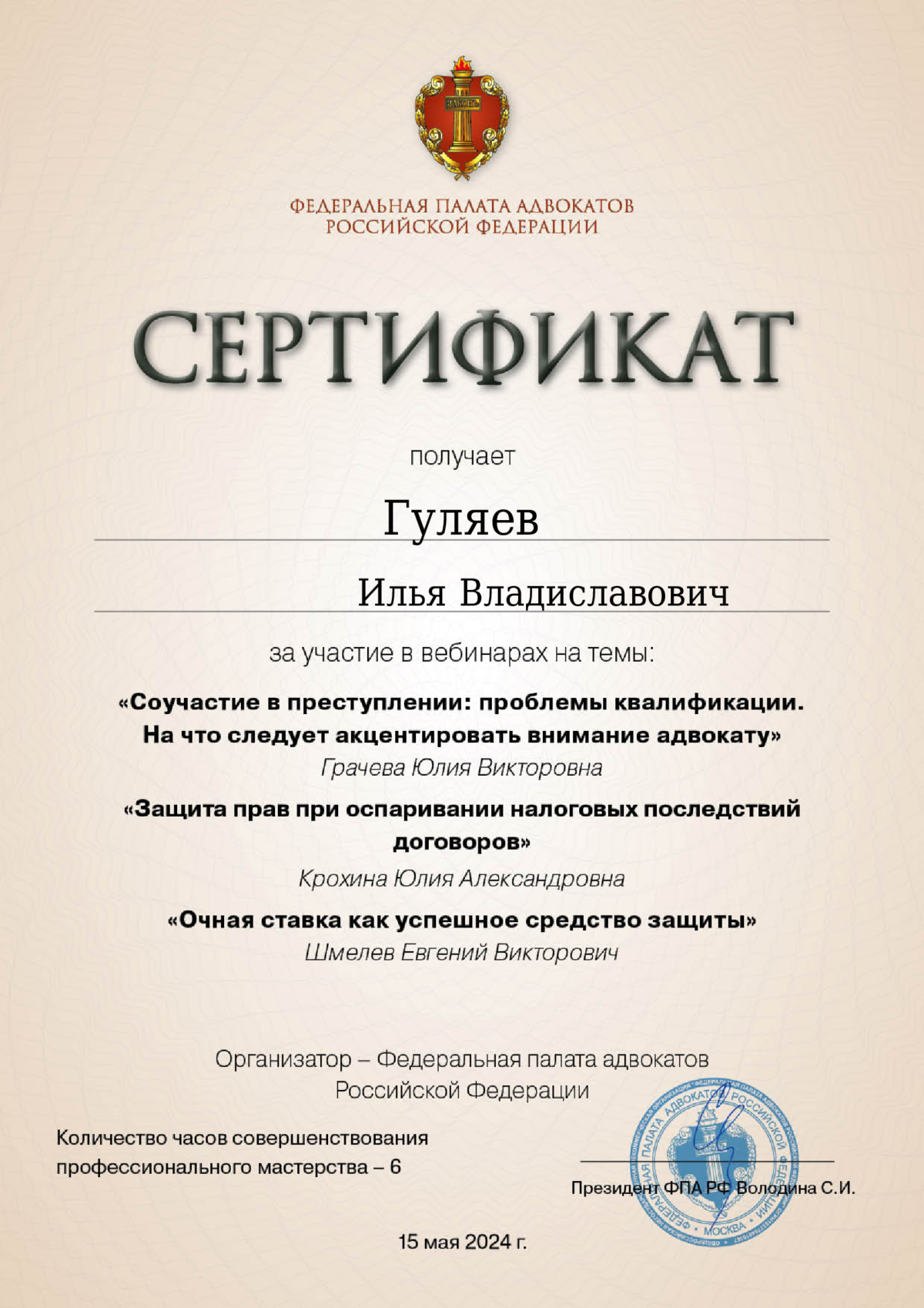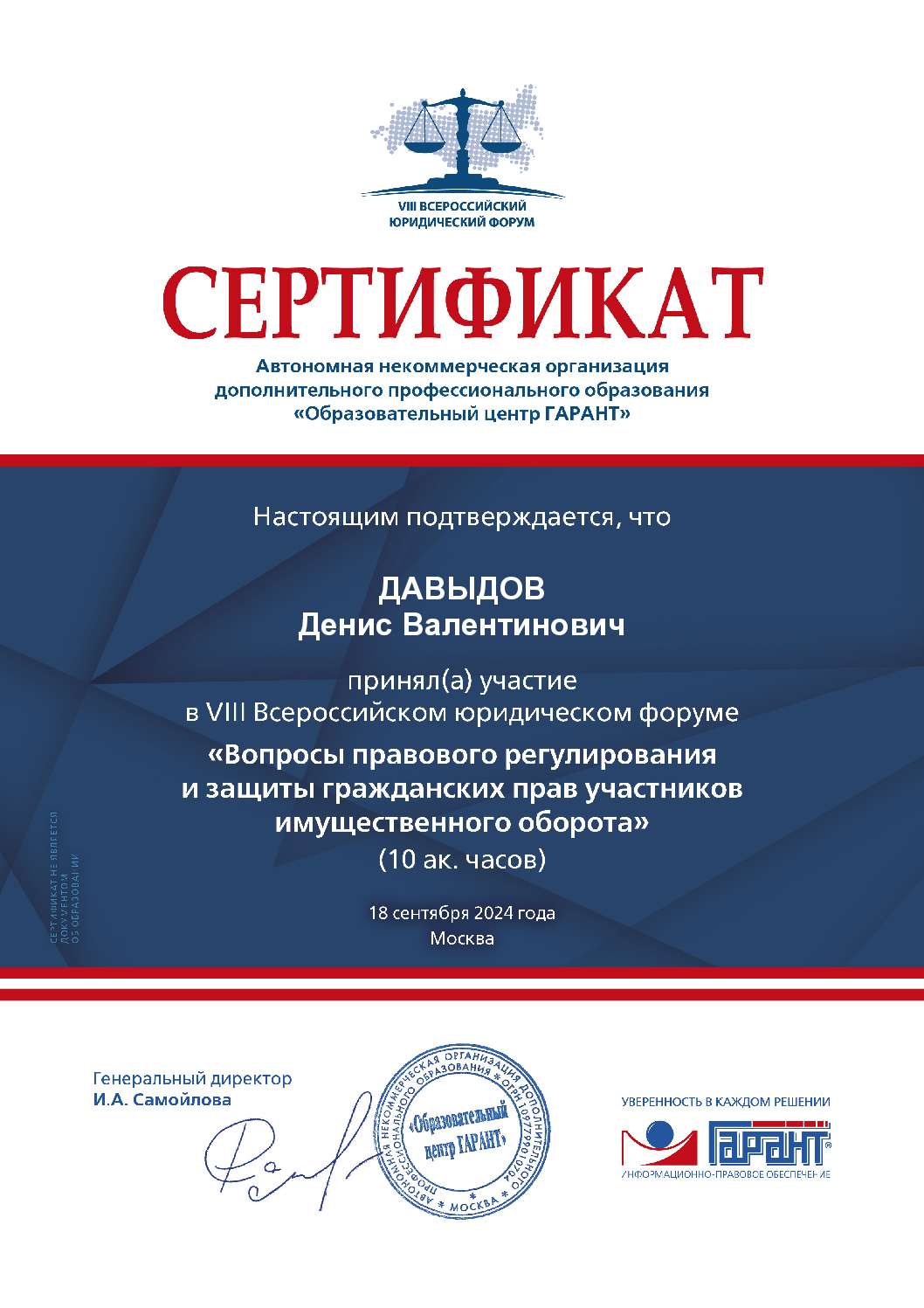 - Сертификат о повышении квалификации по программе "ТОП-10 ключевых действий адвоката в уголовном процессе", ООО "