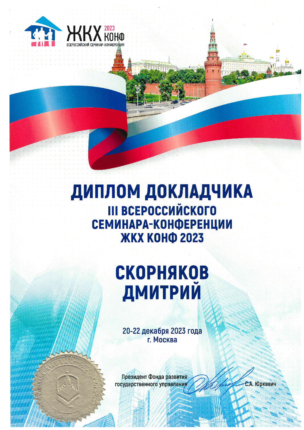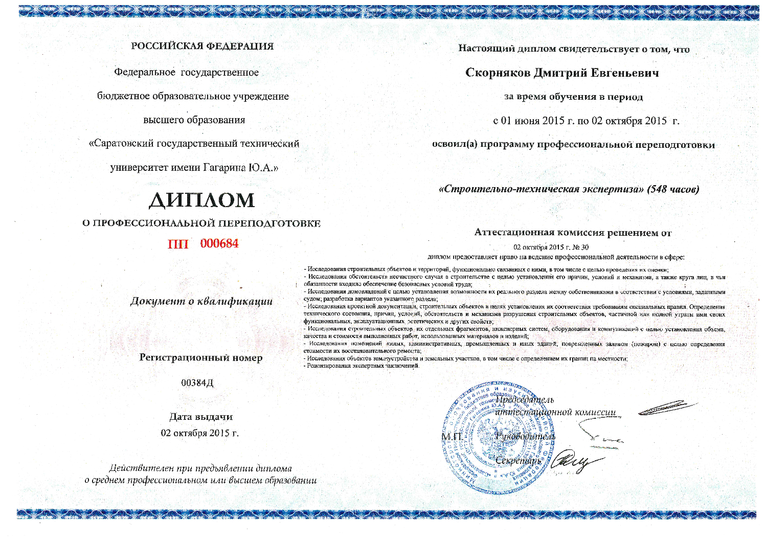 - Сертификат о повышении квалификации по программе " 10 шагов успешного ведения уголовного дела по ДТП", Санкт-Петербургский
