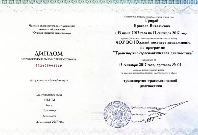 - Диплом по программе "Транспортно-трасологическая диагностика", ЧОУ ВО Южный институт менеджмента;