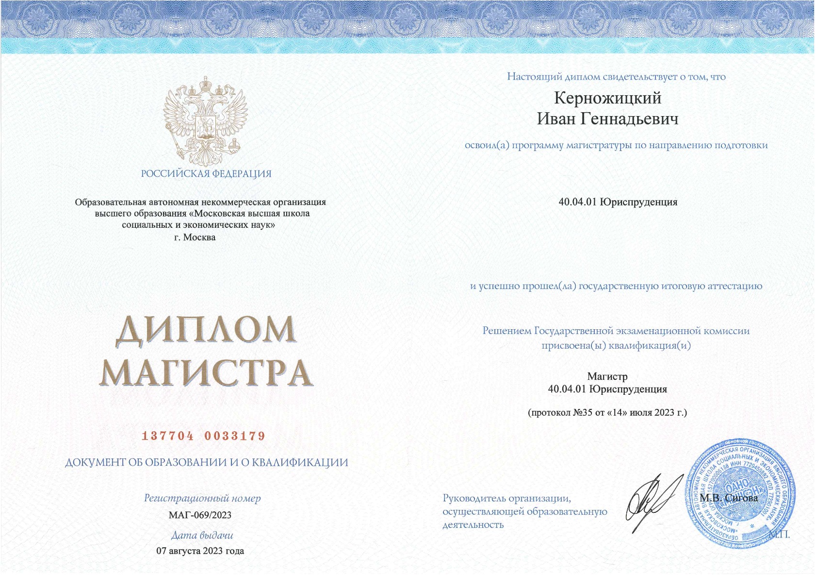 Магистр юриспруденции (МВШСЭН, Шанинка), LLM (Манчестерский университет).
