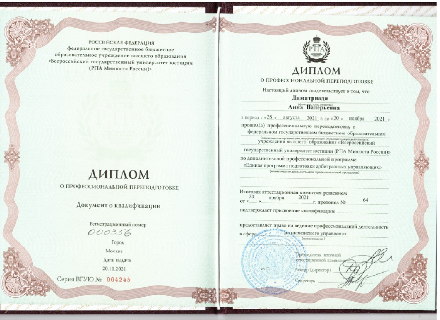 Анна Валерьевна Димитриади — опытный юрист с двумя высшими образованиями в юриспруденции и экономике. Она прошла подготовку арбитражных управляющих в ВГУЮ (РПА Минюста). Более 20 лет проработала в ведущих банках в сфере управления финансовыми рисками.