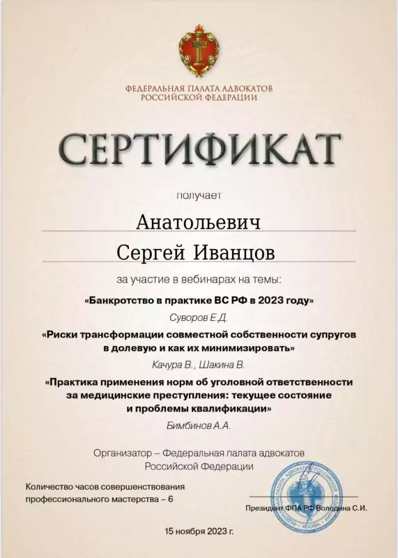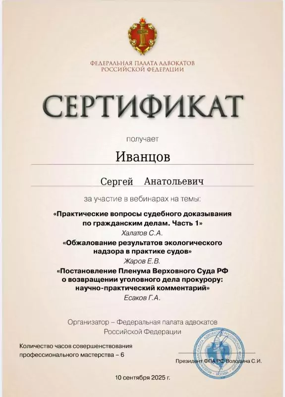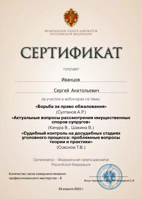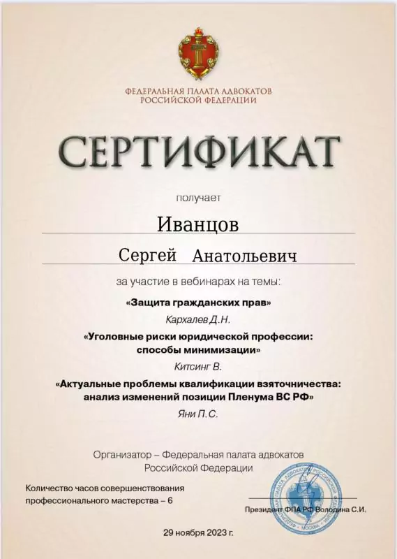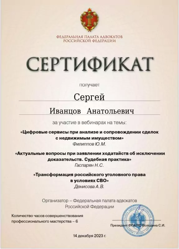 Здравствуйте! Я —Иванцов Сергей, адвокат с более чем 15-летним опытом работы. Обладаю значительным практическим опытом и оказываю качественную юридическую помощь. Длительное время защищаю доверителей по уголовным делам, а также представляю интересы физических и юридических лиц в гражданских, административных и арбитражных судах. Готов ответить на ваши вопросы и помочь в решении юридических проблем.