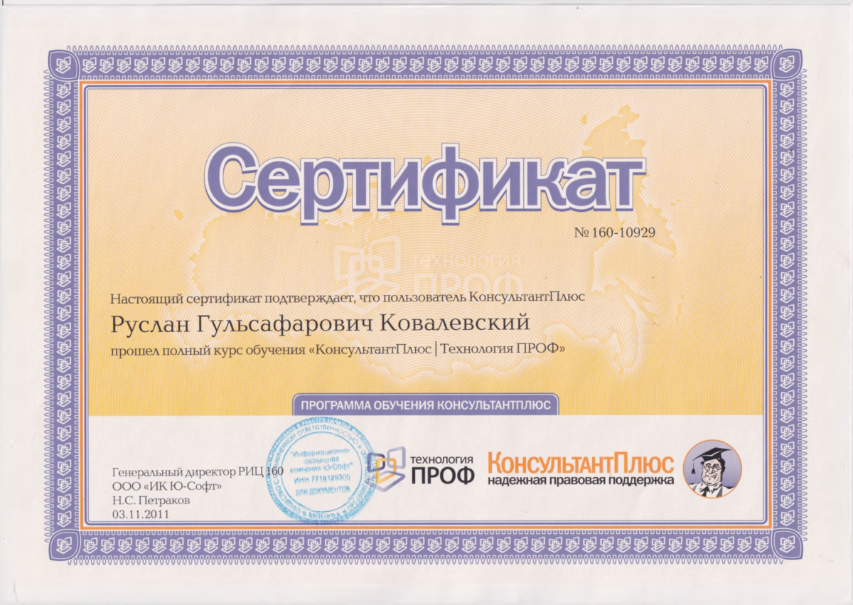 Ковалевский Руслан Гульсафарович предоставляет юридические услуги более 15 лет длч физических лиц по семейным, наследственны, жилищным и земельным спорам. Основные направления деятельности включают суды общей юрисдикции. Услуги оказываются в Москве и Московской области, с возможностью проведения консультаций и оказания практической помощи по актуальным вопросам как онлайн, так и с выездом к клиенту. Основное правило работы — качественное выполнение задач и полная конфиденциальность полученной информации. Используются постоянно обновляемые информационно-правовые базы. Взаимоотношения с клиентами строятся на принципах добропорядочности и открытости.