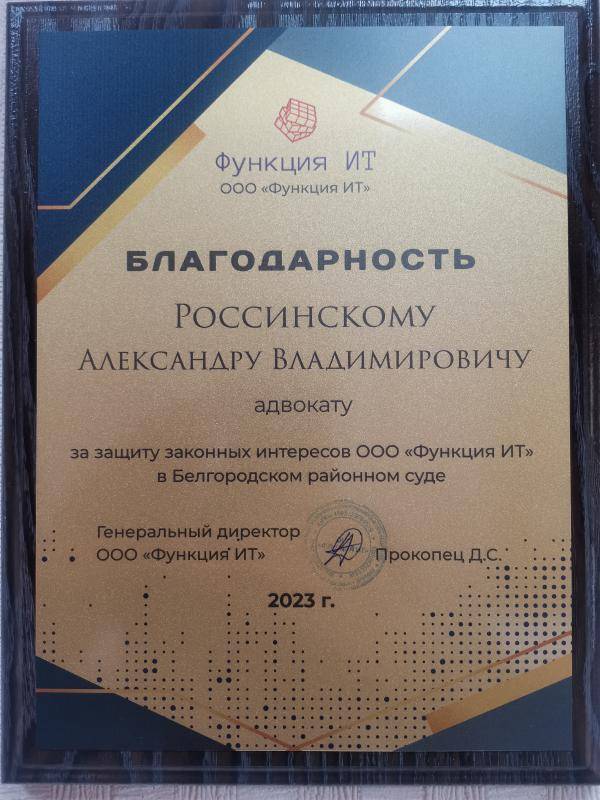 Здравствуйте, я адвокат Александр Россинский. Являюсь членом Адвокатской палаты города Москвы. Регистрационный № 77/17397 в реестре адвокатов города Москвы. Специализируюсь в области гражданского и семейного права. В статусе адвоката практикую с 2010 года. До присвоения статуса работал юристом в агропромышленных холдингах. Общий юридический стаж – 21 год. Многолетний опыт, а также постоянная обширная судебная практика по гражданским делам различной направленности и степени сложности позволяет оказывать услуги своим доверителям на высоком профессиональном уровне. Обращаясь за юридической помощью ко мне, Вы получаете исчерпывающие ответы на свои вопросы, необходимые рекомендации и правовой анализ проблемы, а также перспективы и практические способы решения вопроса. Я гарантирую профессиональную поддержку и индивидуальный подход в решении Вашей проблемы.