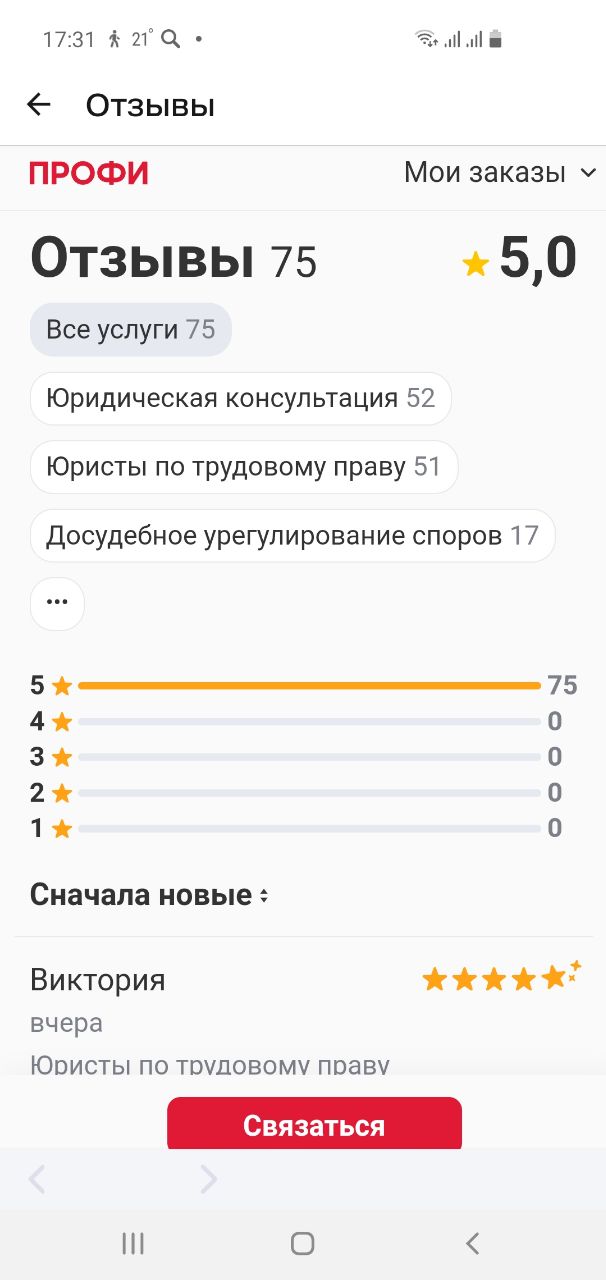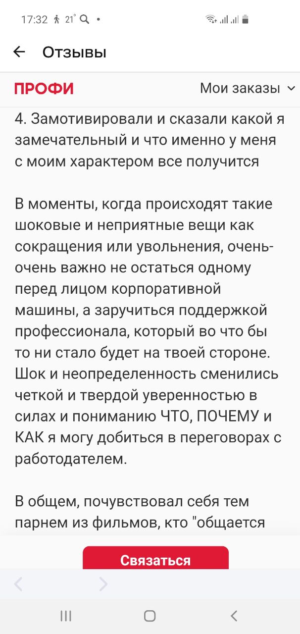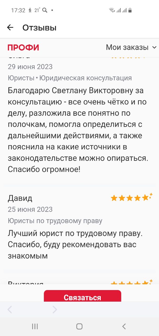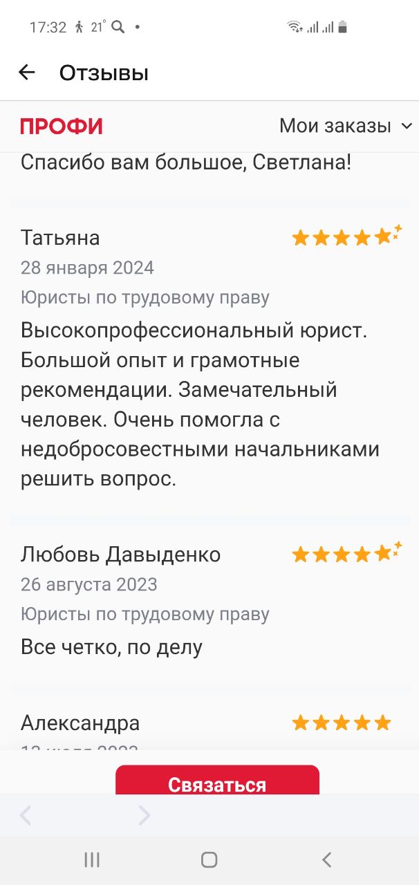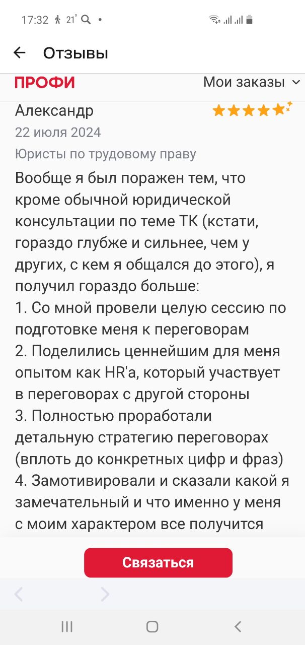 Специализация: трудовые споры и подготовка к сложным переговорам. – более 20 лет руководства в сфере управления персоналом в крупных корпорациях; – более 20 лет юридической практики и частный консалтинг физ. и юр лиц – дипломированный специалист в области медиации и урегулирования споров, юрист, экономист ЭКСПЕРТНОСТЬ: в досудебном урегулировании трудовых споров, практической подготовке к сложным переговорам, разработке и реализации стратегии и сопровождении клиента до результата ОПЕРАТИВНО: получение оценки ситуации и проноза за 15 минут ПРОФЕССИОНАЛЬНО: управление ситуацией, владение методами разрешения конфликтов, психологическая поддержка НАДЕЖНО: практические знания HR, помощь в реализации плана действий. Конфиденциальность. 100% – Честность в отношении результата, разработка стратегии. 100% – Простые объяснения сложных юридических формулировок. 100% – Обучение технике и тактике ведения переговоров +1000 успешно решенных задач, 90 % споров разрешены в досудебном порядке.