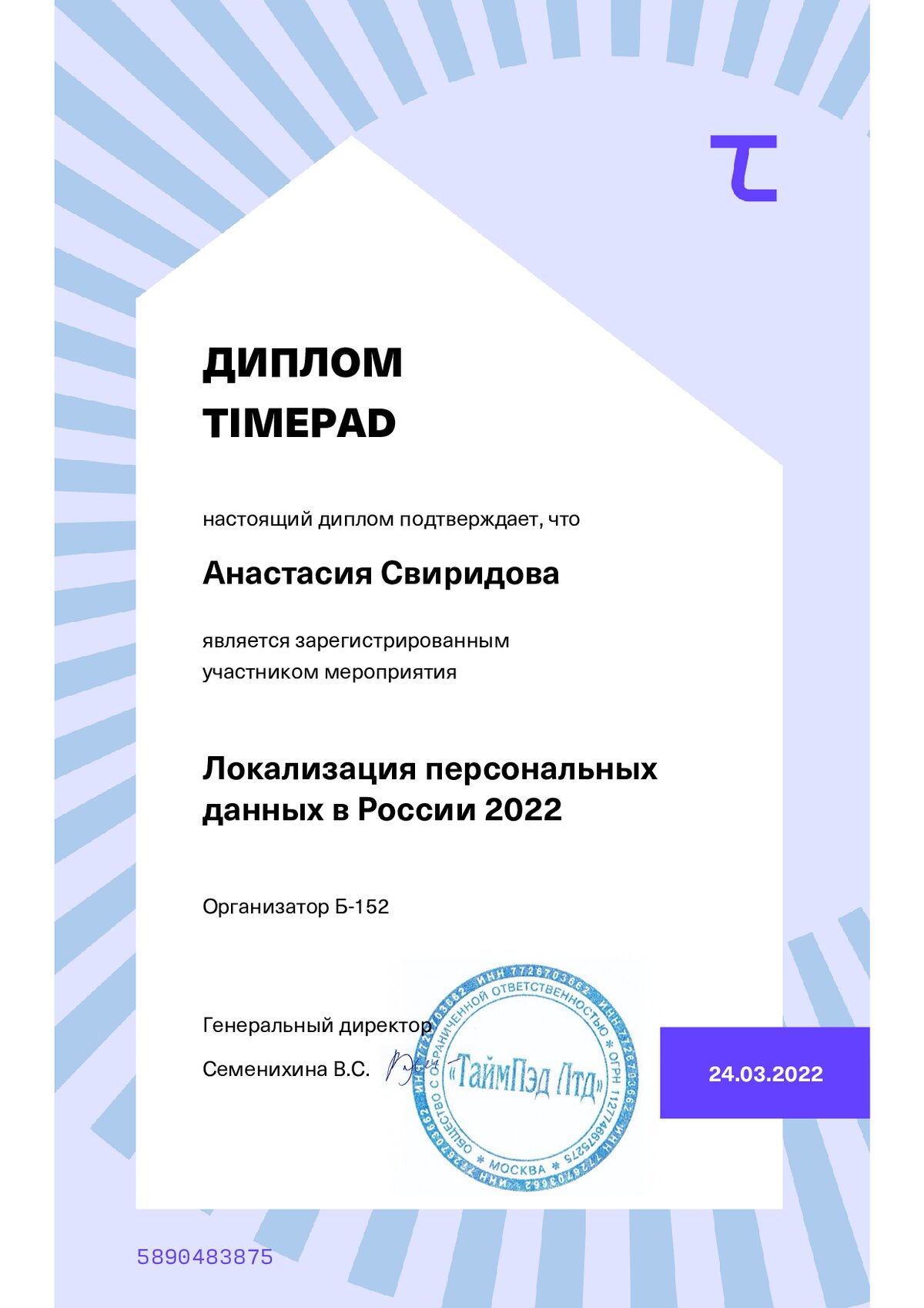 В 2011 году прошла обучение в г. Цюрих (Швейцария) в области Налогового и банковского права. Ежегодно повышаю квалификацию.