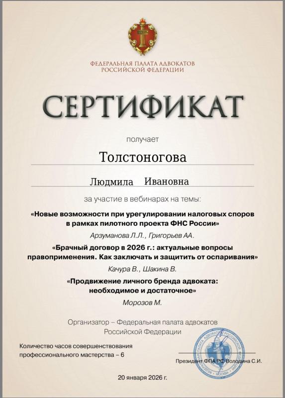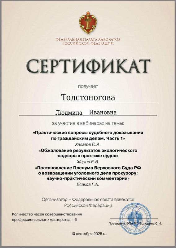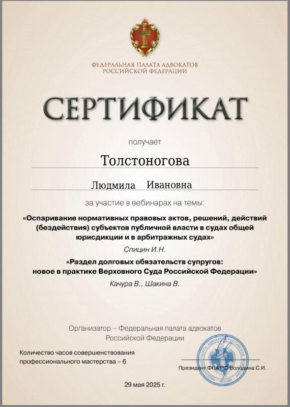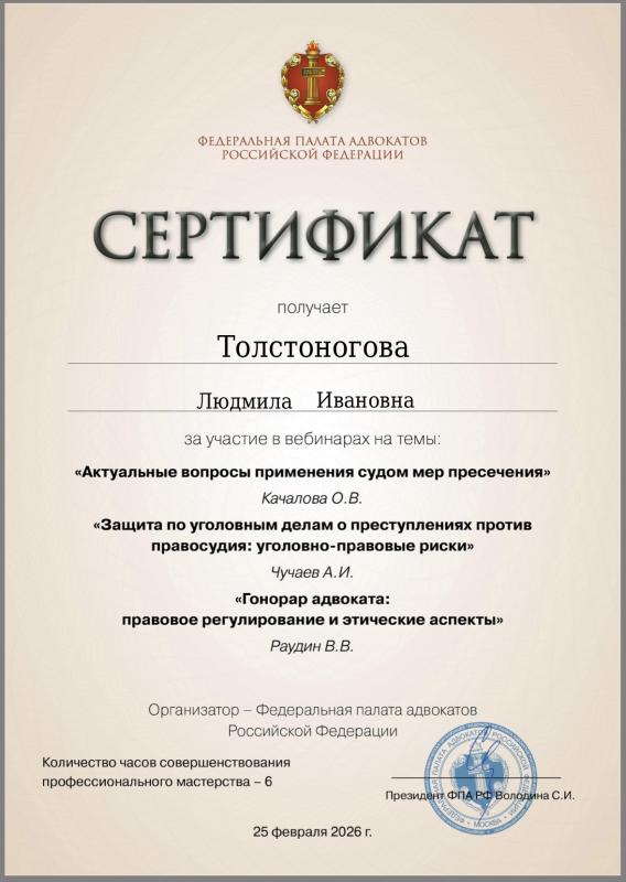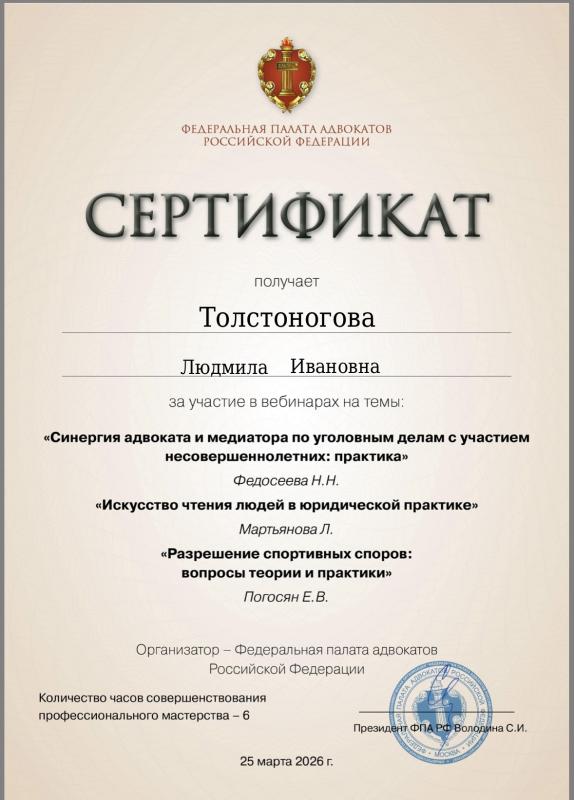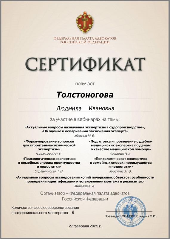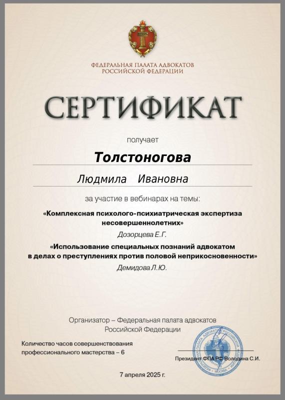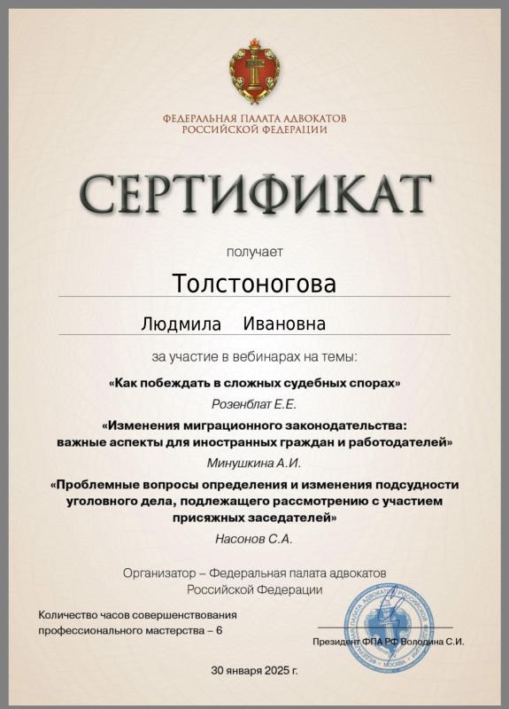 Толстоногова Людмила Ивановна — адвокат, регистрационный номер 50/6311, член Адвокатской палаты Московской области и Коллегии адвокатов г. Москвы «Династия».
