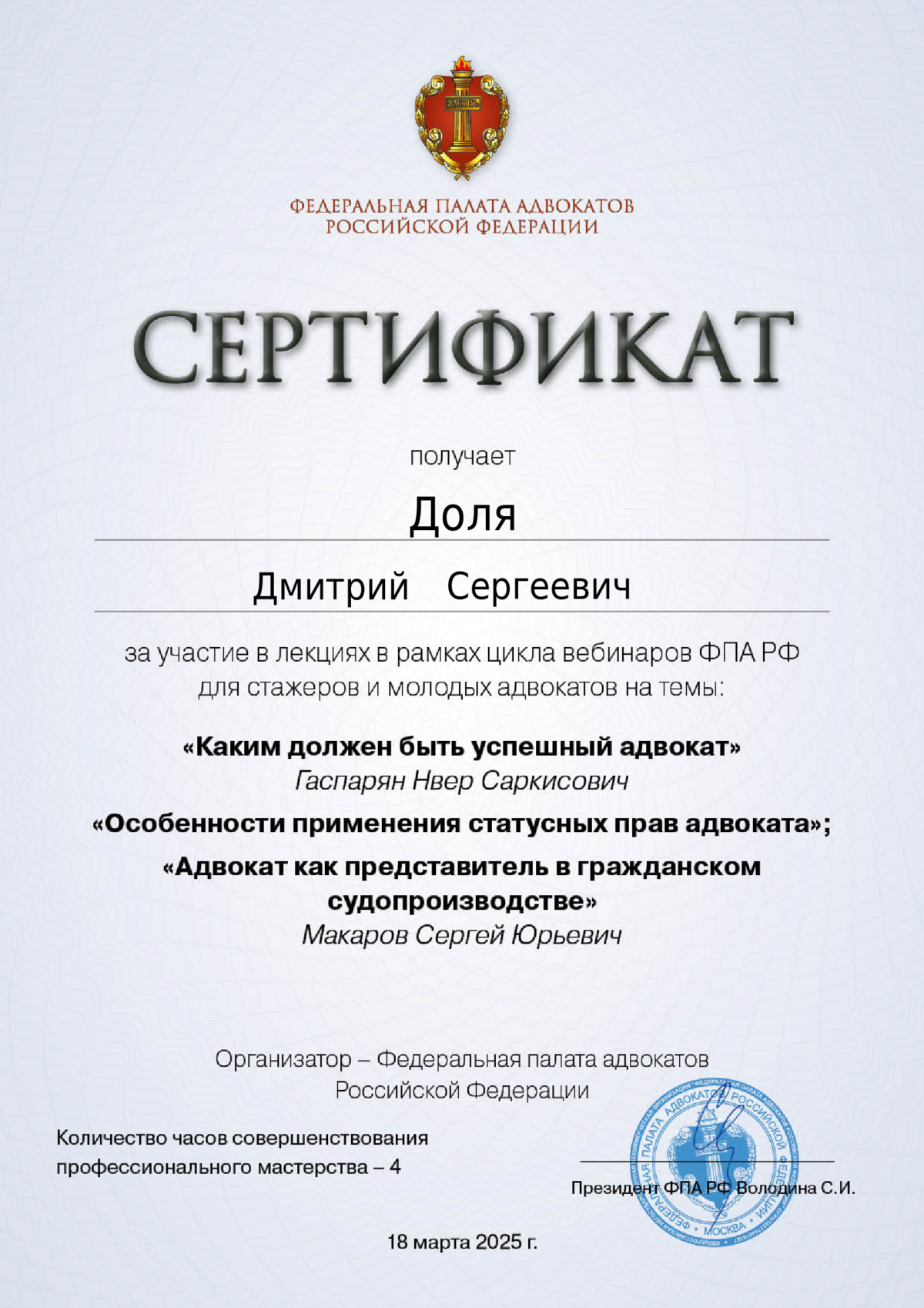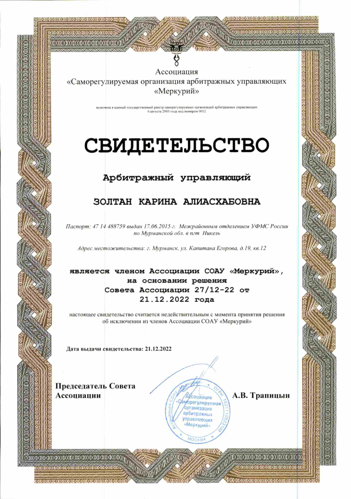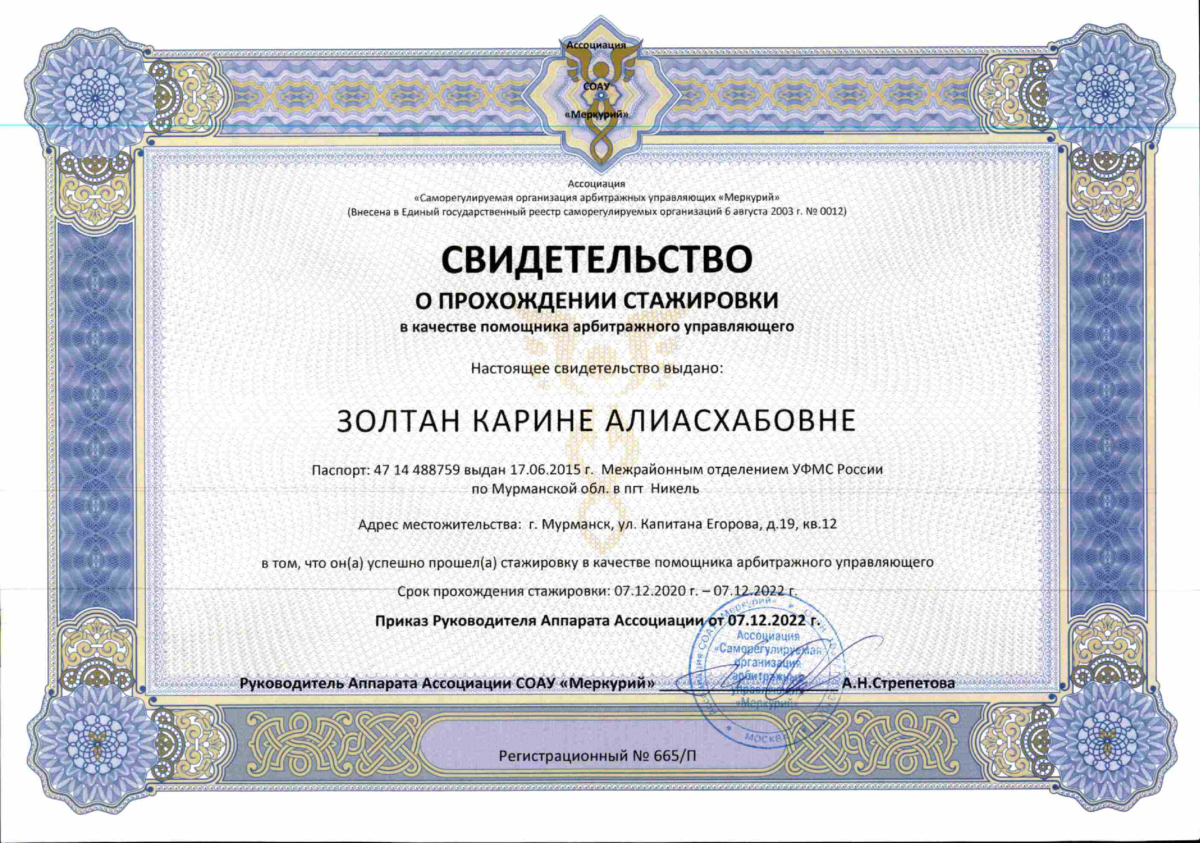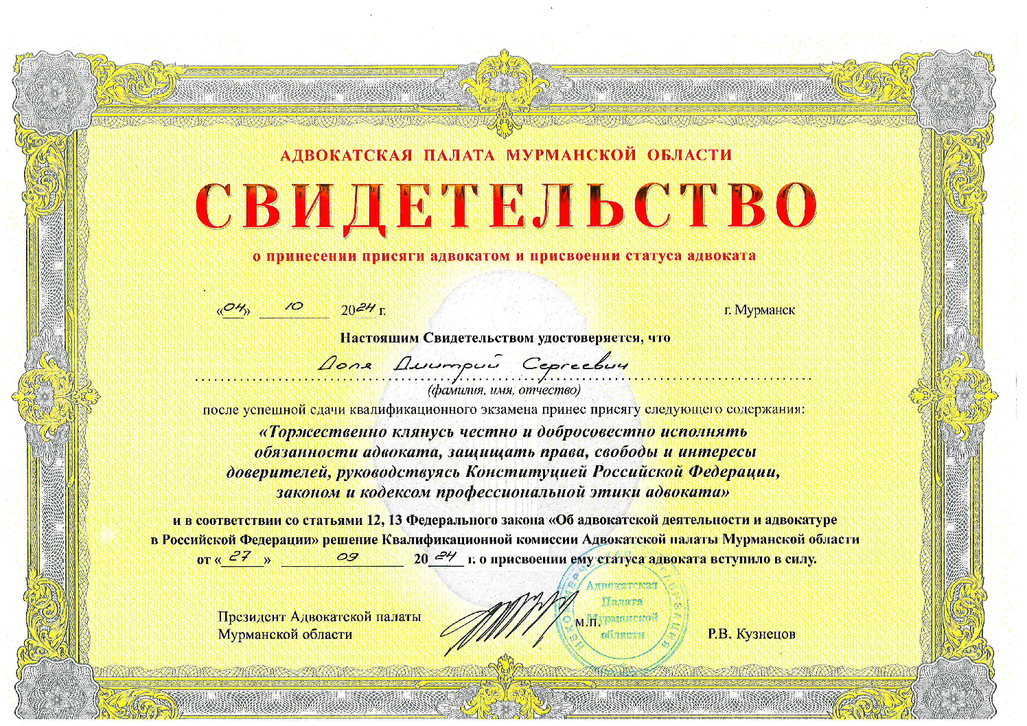 Адвокат адвокатской палаты Мурманской области по гражданским и уголовным делам. Регистрационный номер в реестре адвокатов 51/889