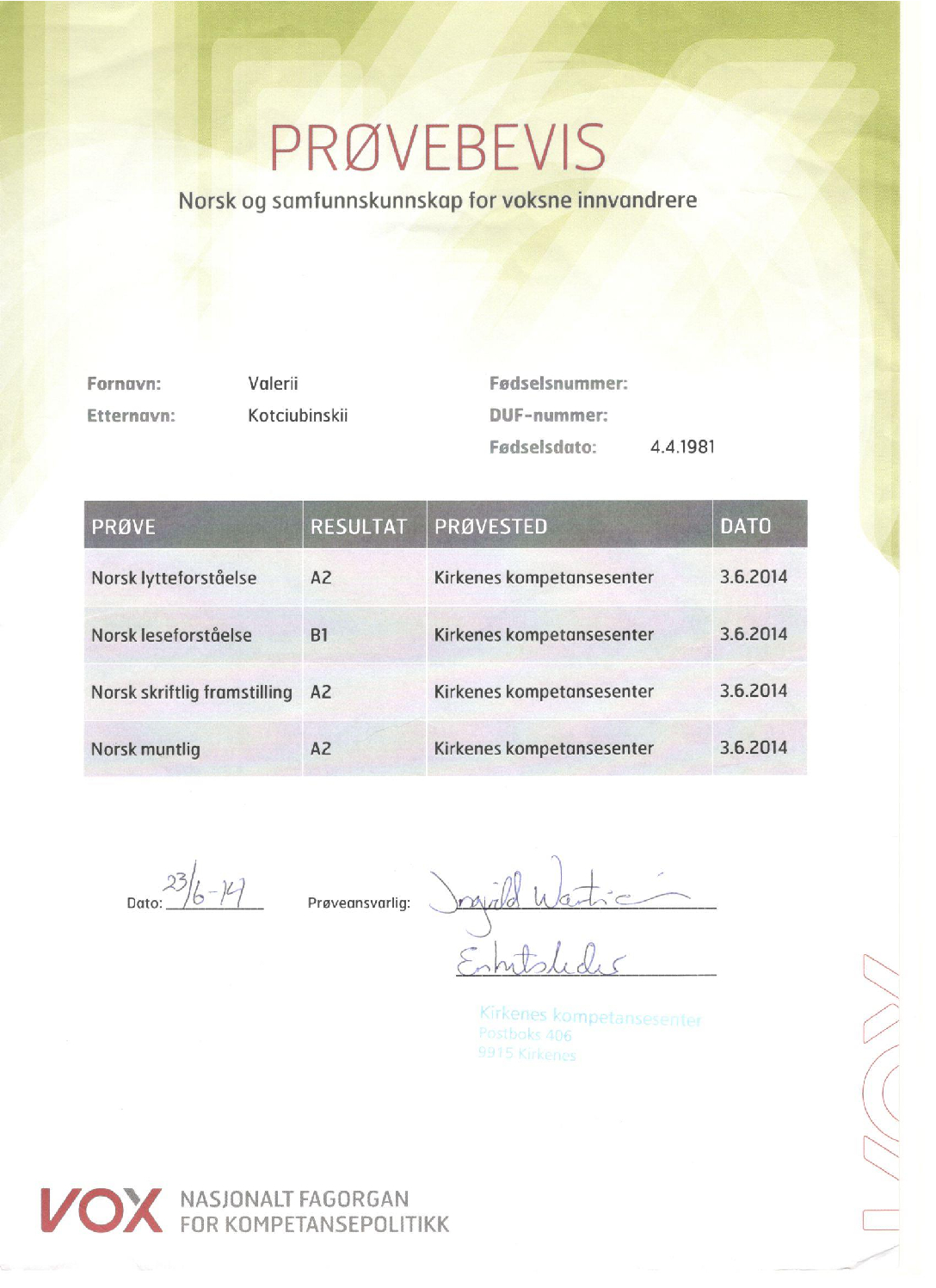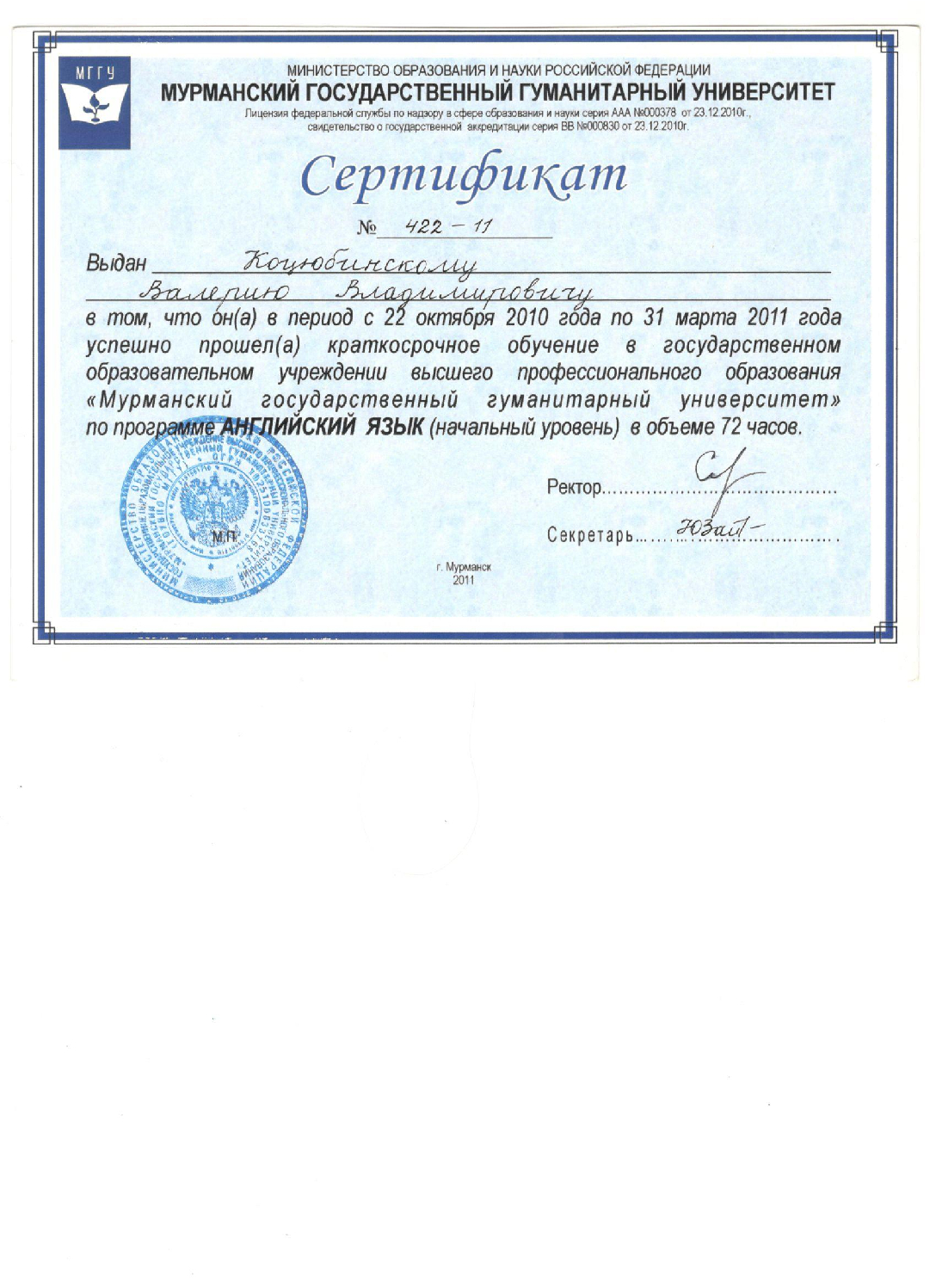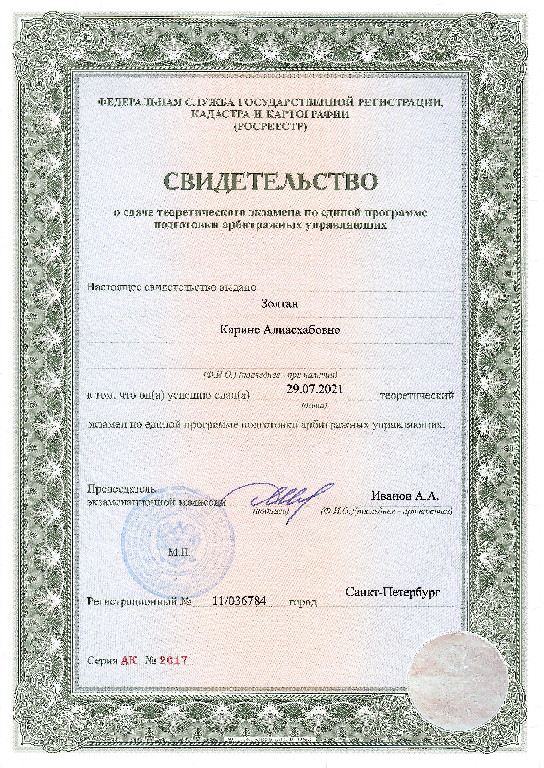 Адвокат адвокатской палаты Мурманской области по гражданским и уголовным делам. Регистрационный номер в реестре адвокатов 51/889