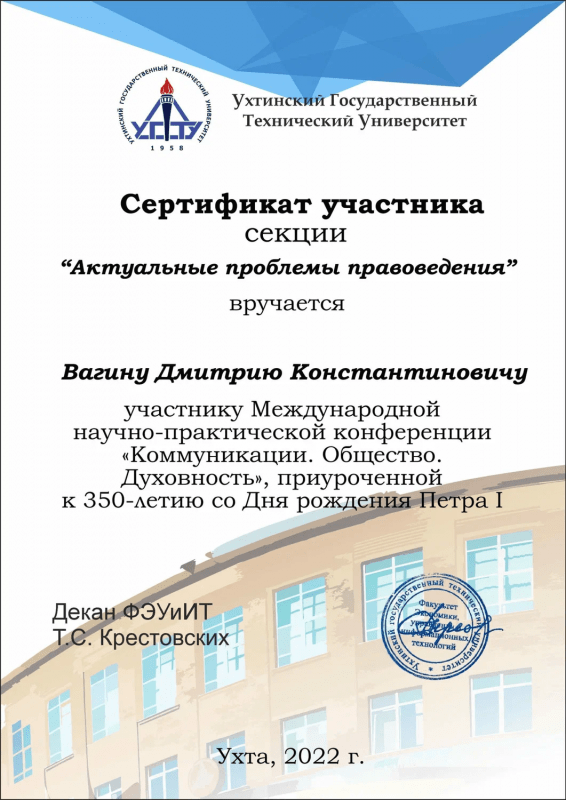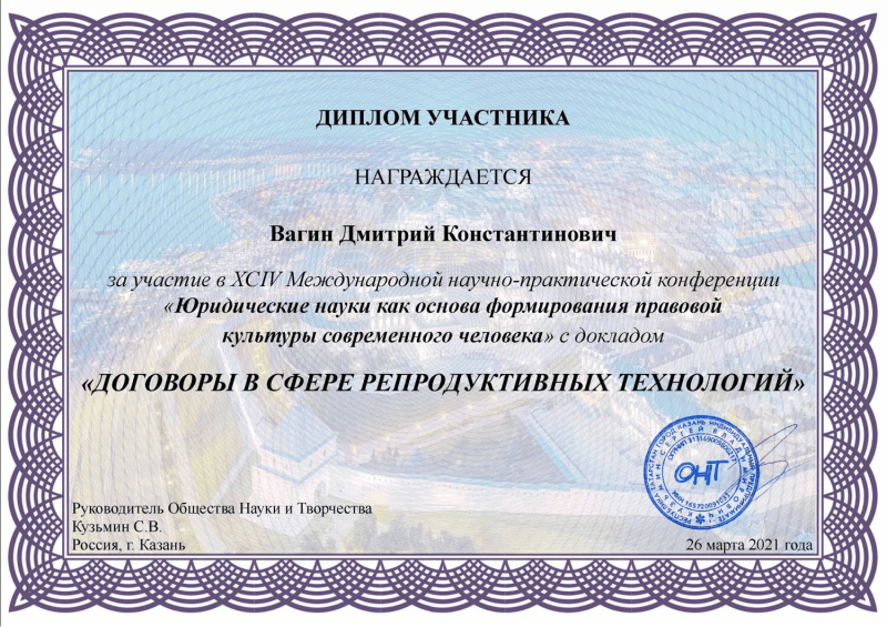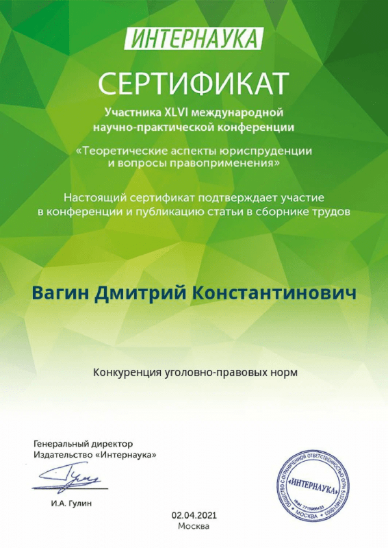Автор диссертации в сфере хозяйственного права, ряда научных статей, участник международных конференций в области права.