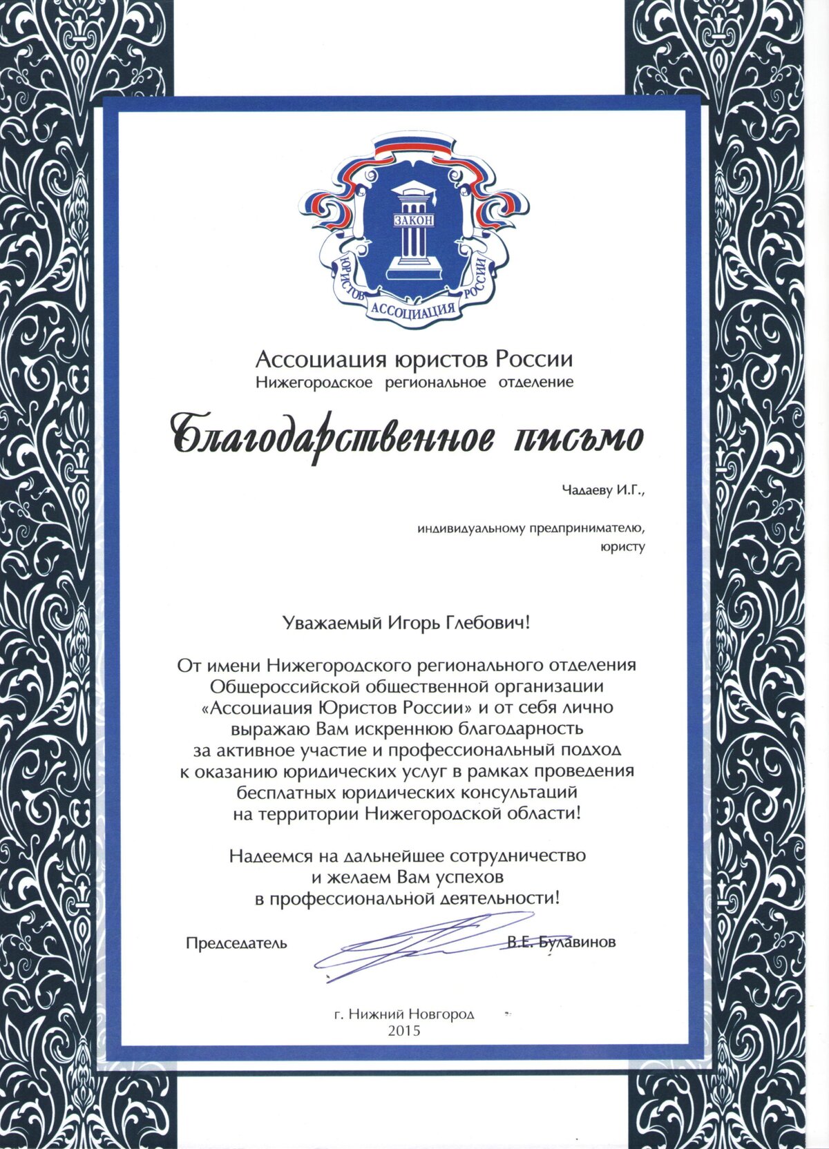 Член Ассоциации Юристов России (удостоверение № 52/00010985). Индивидуальный предприниматель с 13 сентября 2012 г. ОГРНИП 312525825700021 (Деятельность в области права и бухгалтерского учета). Возможна оплата на расчетный счет. Работал юристом в коммерческих организациях и заместителем руководителя по правовым вопросам и безопасности в строительных компаниях, адвокатом, в Российском фонде федерального имущества, в Министерстве строительства Нижегородской области, в коммерческих организациях, в ФГБУ “Авиаметтелеком Росгидромета”.