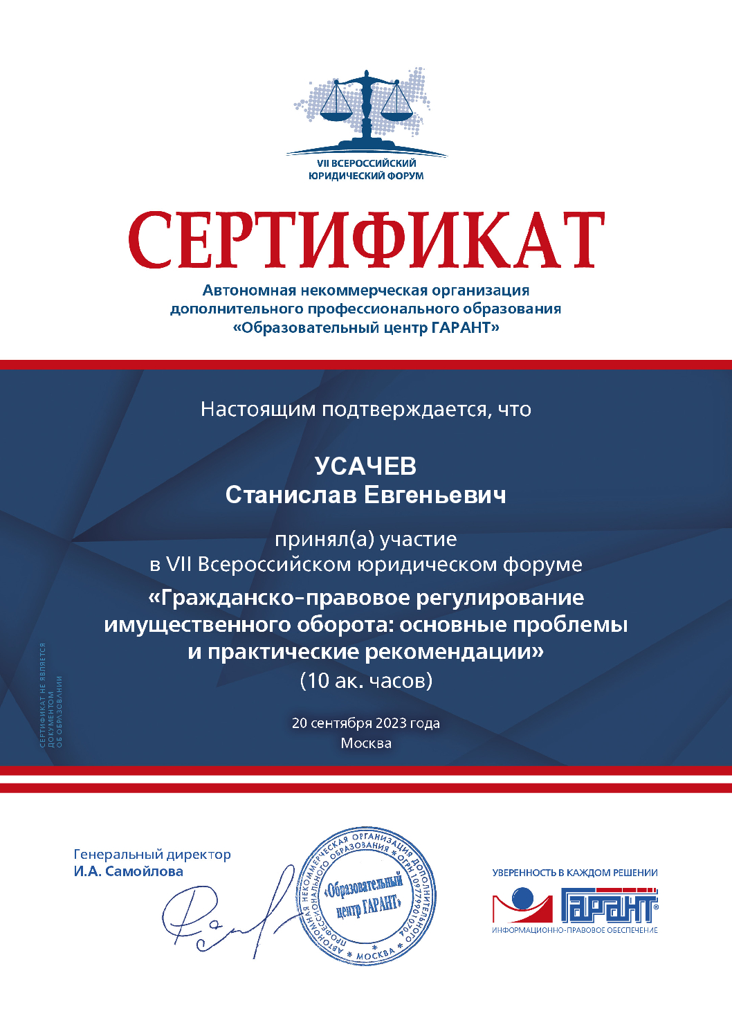 Я получил высшее образование в Международном Институте Экономики и Права. Моя юридическая практика началась еще до поступления в вуз, что и стало причиной получения высшего юридического образования. В 2009 году я решил развиваться дальше и открыл собственное юридическое агентство - ООО "Юридическое Агентство 'Усачев и К'". Я специализируюсь на защите прав потребителей, спорах со страховыми компаниями по ОСАГО и КАСКО, а также на земельных, семейных, наследственных и пенсионных делах. Рассмотрение дел происходит в мировых судах, районных, апелляционных и кассационных инстанциях как в Кемеровской области, так и за её пределами. В настоящее время я продолжаю учиться, так как постоянно появляются новые судебные практики, решения и ежегодные изменения в законодательстве. Это требует постоянного внимания и обновления знаний.