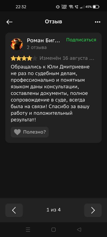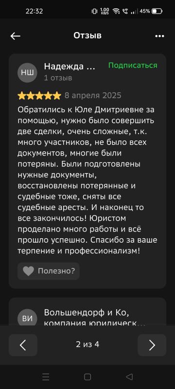 Здравствуйте, уважаемые клиенты и посетители сайта, буду рада оказать вам любые юридические услуги ✅ Консультации дистанционные(whats app skype viber) письменные, ✅ Дистанционное составление процессуальных документов,(исков,претензий,жалоб в судебные и любые иные государственное органы,а также написание апелляционных кассационных жалоб в суды) ✅ Сопровождение сделок ✅Обслуживание юридических лиц