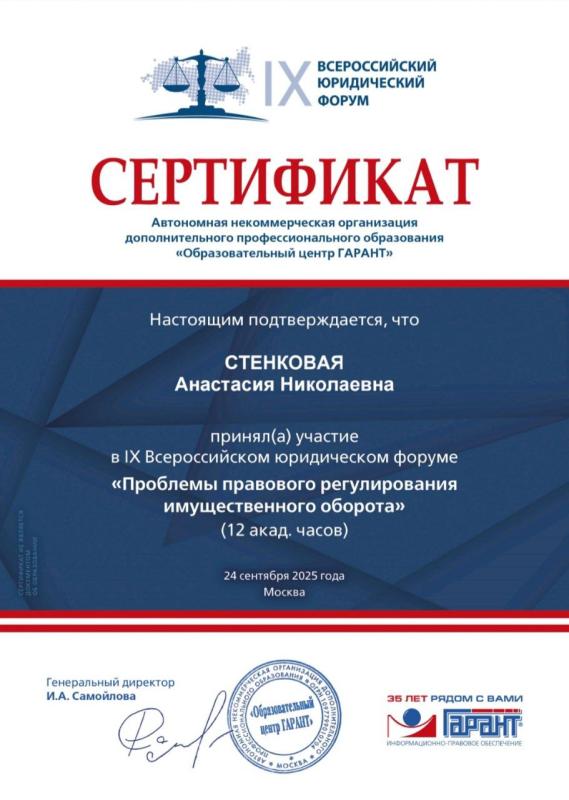 Стенковая Анастасия Николаевна, юрист, индивидуальный предприниматель (ИНН 540232579644, ОКВЭД 69.10 - деятельность в области права) Год рождения: 1981 Год начала судебной практики: 2003 Образование: основное: высшее юридическое (1998-2003), специализация “гражданское право”, специальность “юрист” дополнительное образование: единая программа подготовки арбитражных управляющих (2015г.), специальность “арбитражный управляющий”, с 2015г. - обязательные ежегодные курсы повышения квалификации. Специализация (гражданско-правовая). Споры, связанные: - с применением закона о банкротстве; - с взысканием задолженности; - с признанием прав на имущество, истребованием имущества от третьих лиц; - с заключением, исполнением, прекращением договоров; - с применением штрафных санкций и обеспечительных мер; - иные споры, связанные с защитой имущественных прав