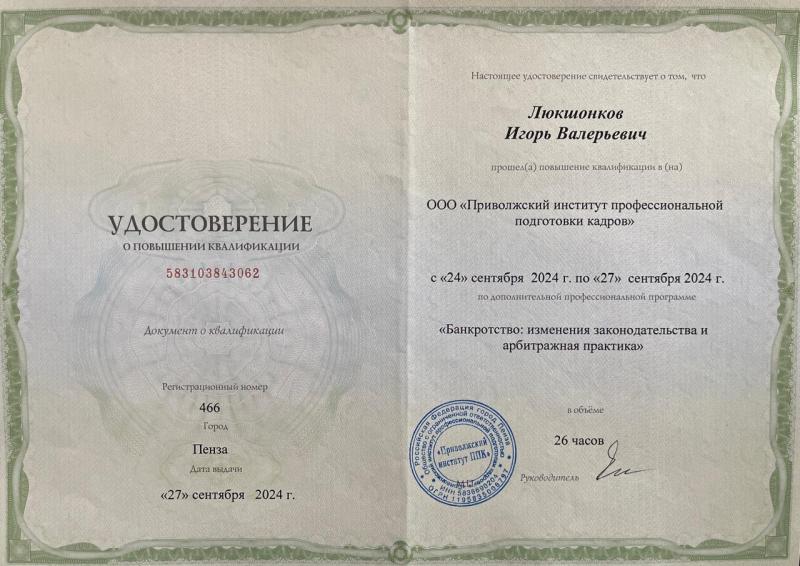 Я, Игорь Валерьевич Люкшонков, юрист, арбитражный управляющий с 2006 года и член ААУ “Арсенал”, провел более 500 процедур банкротства. Я специализируюсь на банкротстве физлиц и предприятий, взысканию долгов, экономических спорах, арбитраж, судебное представительство, подготовка документов и представительство Ваших интересов в суде!