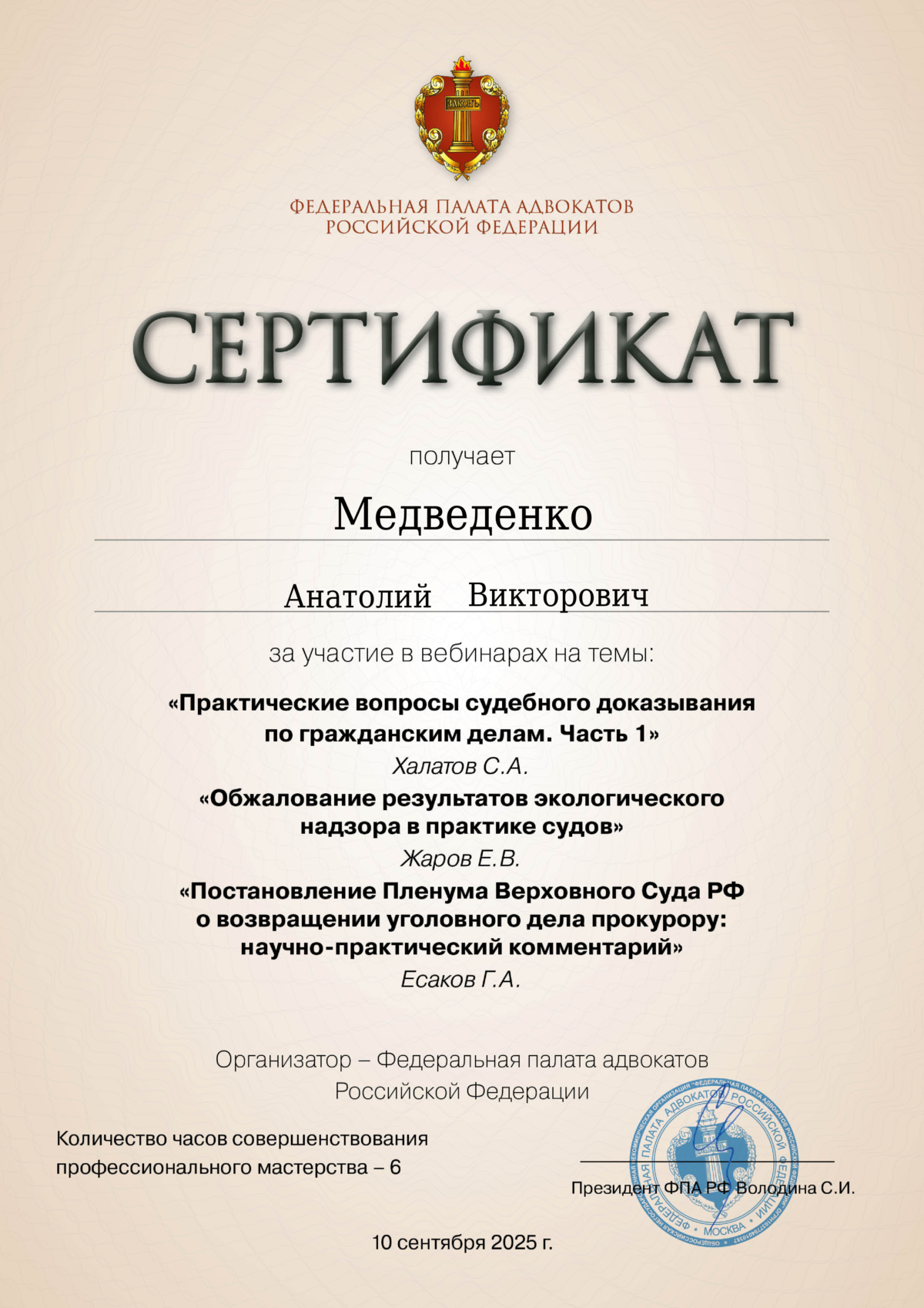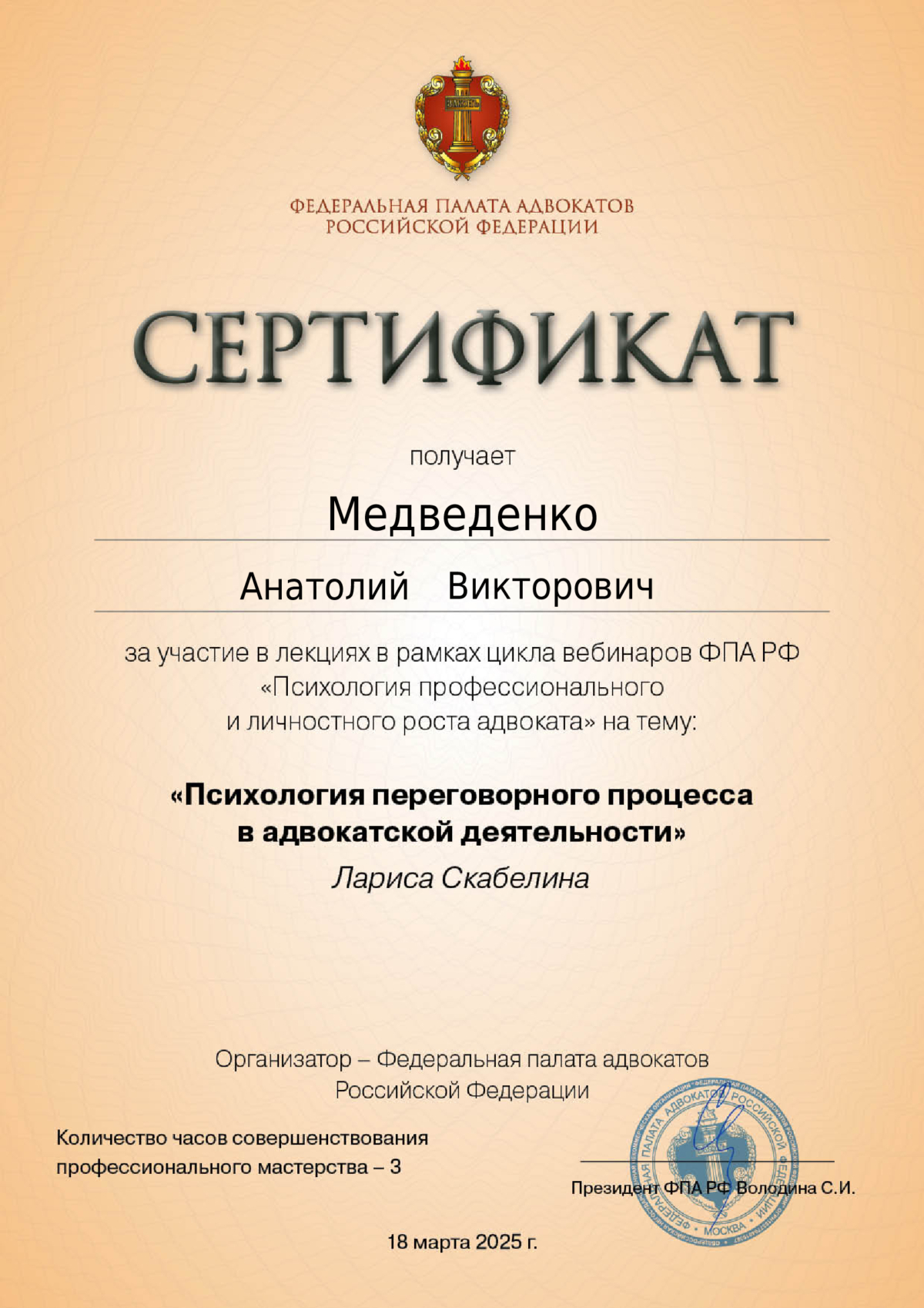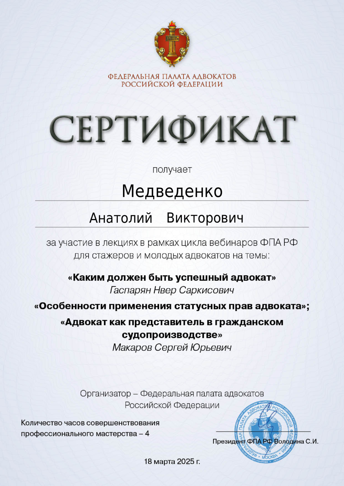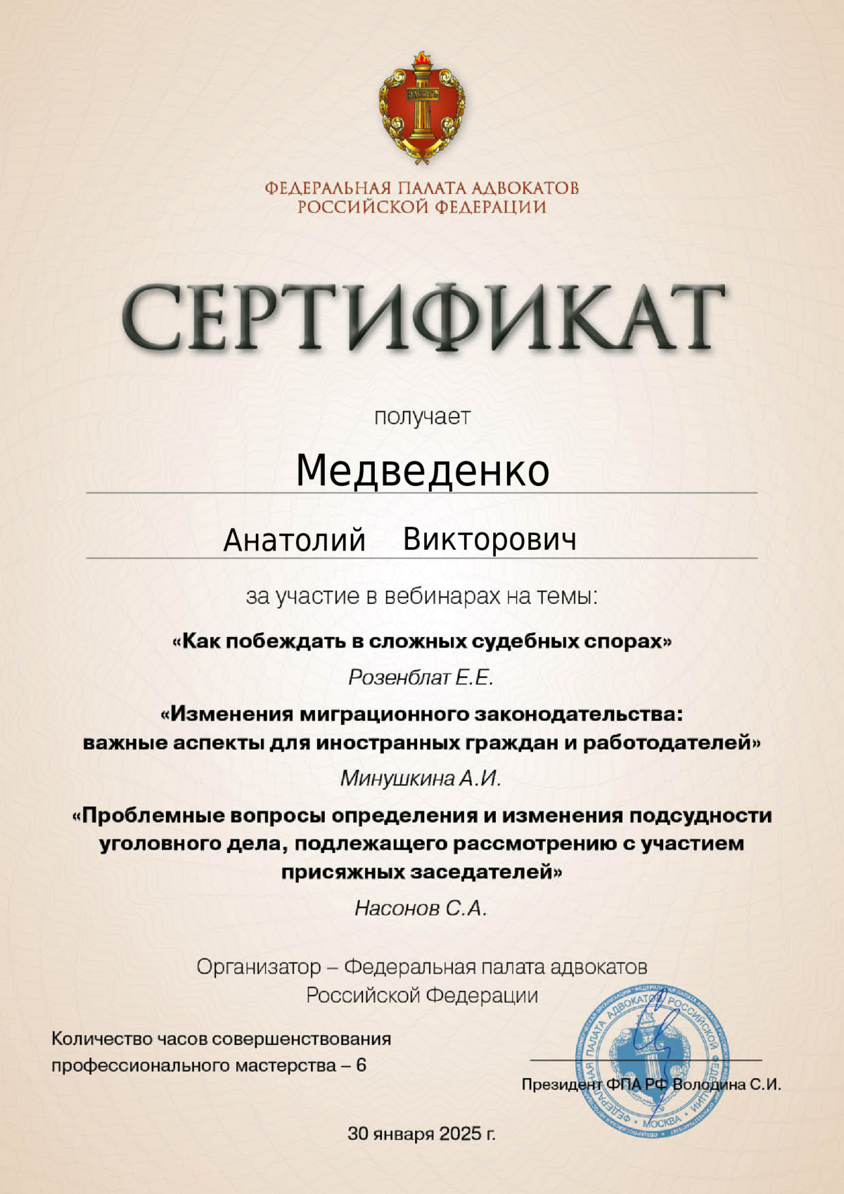 Список судебных дел в карточке адвоката может быть не полным и зависит от того, указан ли адвокат Медведенко Анатолий Викторович в деле или нет