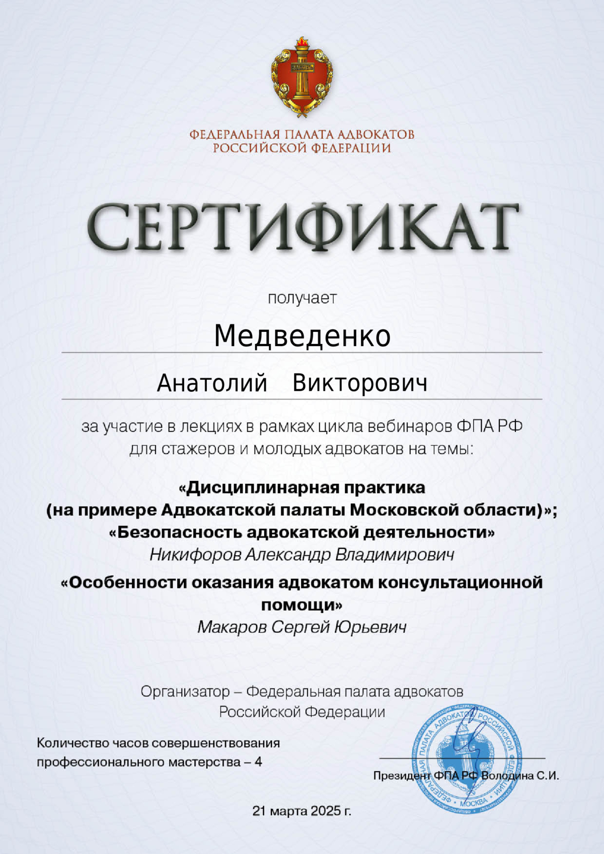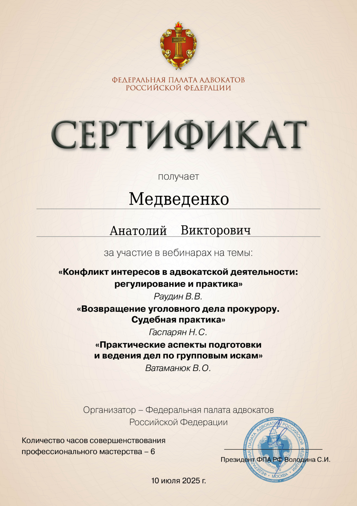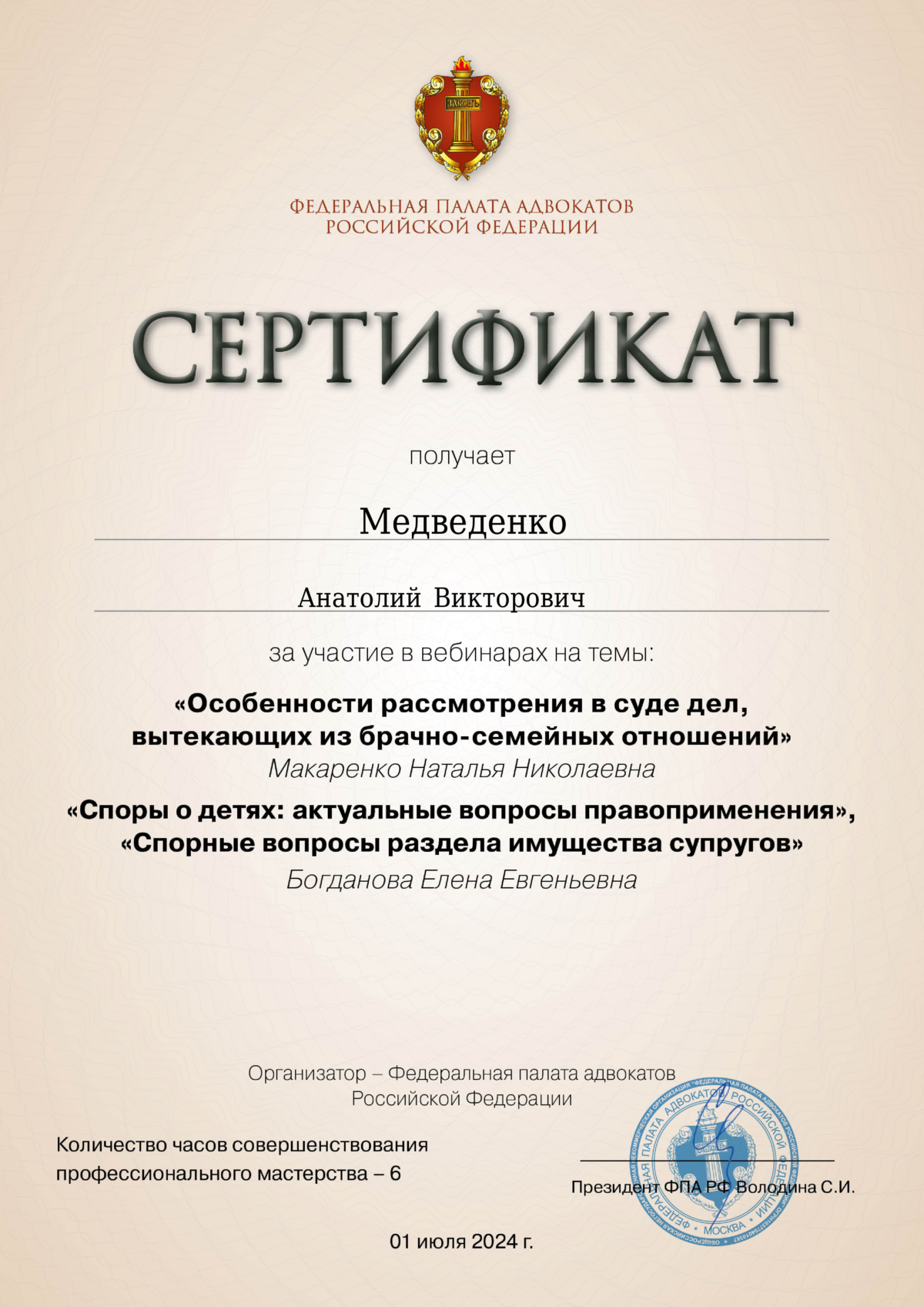 Список судебных дел в карточке адвоката может быть не полным и зависит от того, указан ли адвокат Медведенко Анатолий Викторович в деле или нет