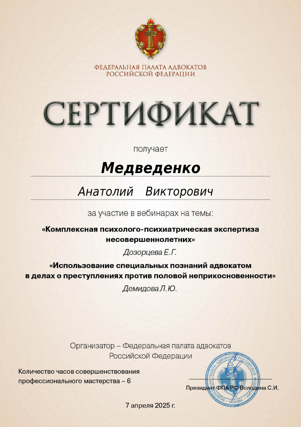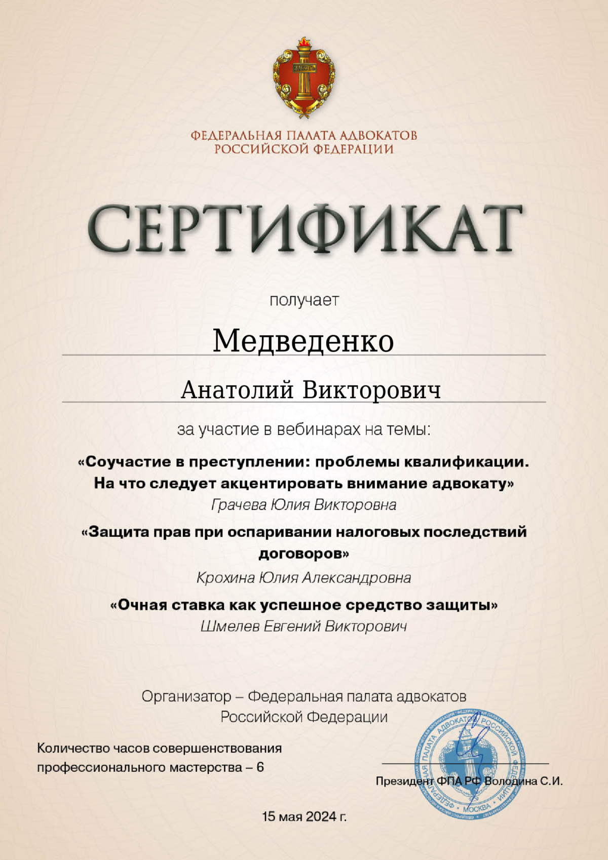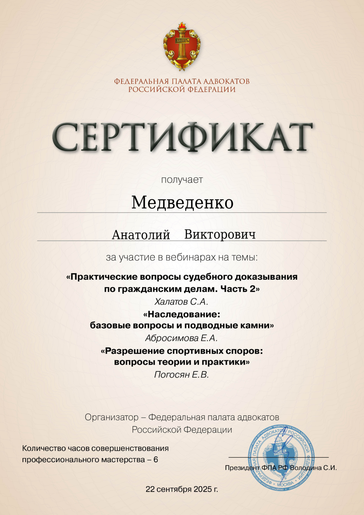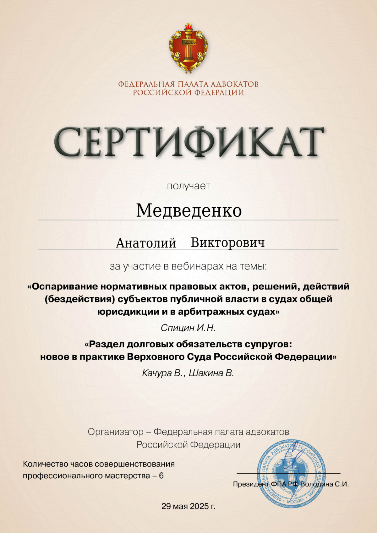 Список судебных дел в карточке адвоката может быть не полным и зависит от того, указан ли адвокат Медведенко Анатолий Викторович в деле или нет