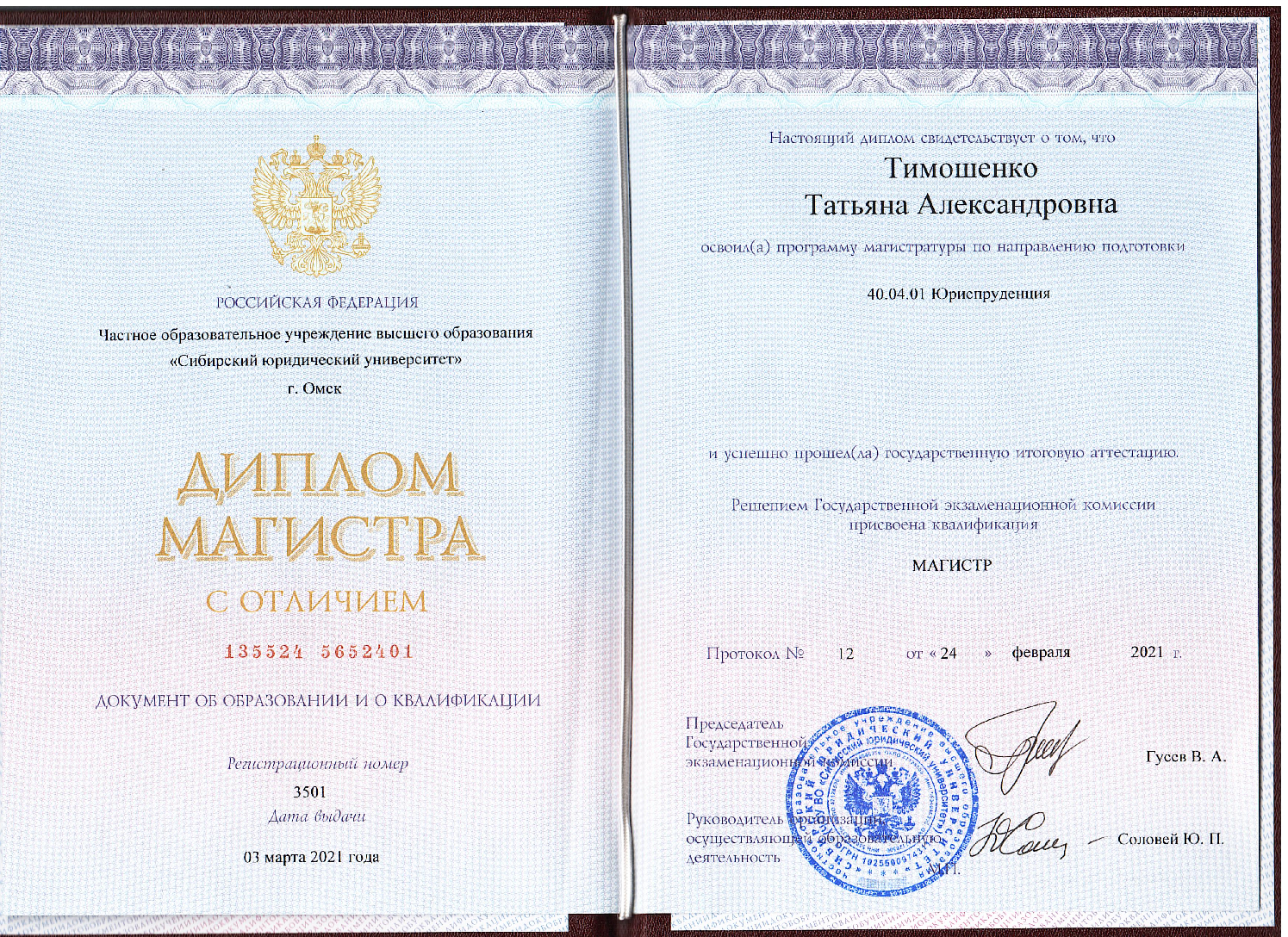 Образование: Сибирский институт бизнеса и информационных технологий. Дополнительное образование: - Специалист по медицинскому праву, Академия экспертизы и оценки (2018 год). - Специалист по юридической психологии, Академия экспертизы и оценки (2020 год).