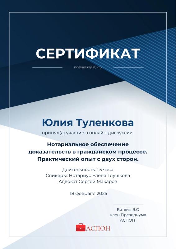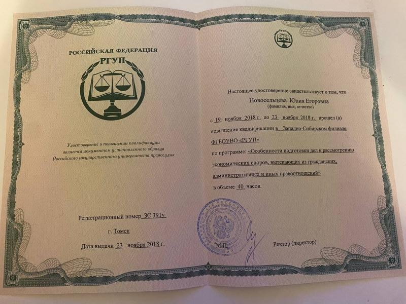 Сейчас я повышаю квалификацию. Недавно начала вести арбитражные дела (повышение квалификации связано именно с этим), вообще всегда стремлюсь к обучению и развитию. Также готовлюсь к экзамену на статус адвоката. Буду рада видеть Вас в числе своих доверителей.